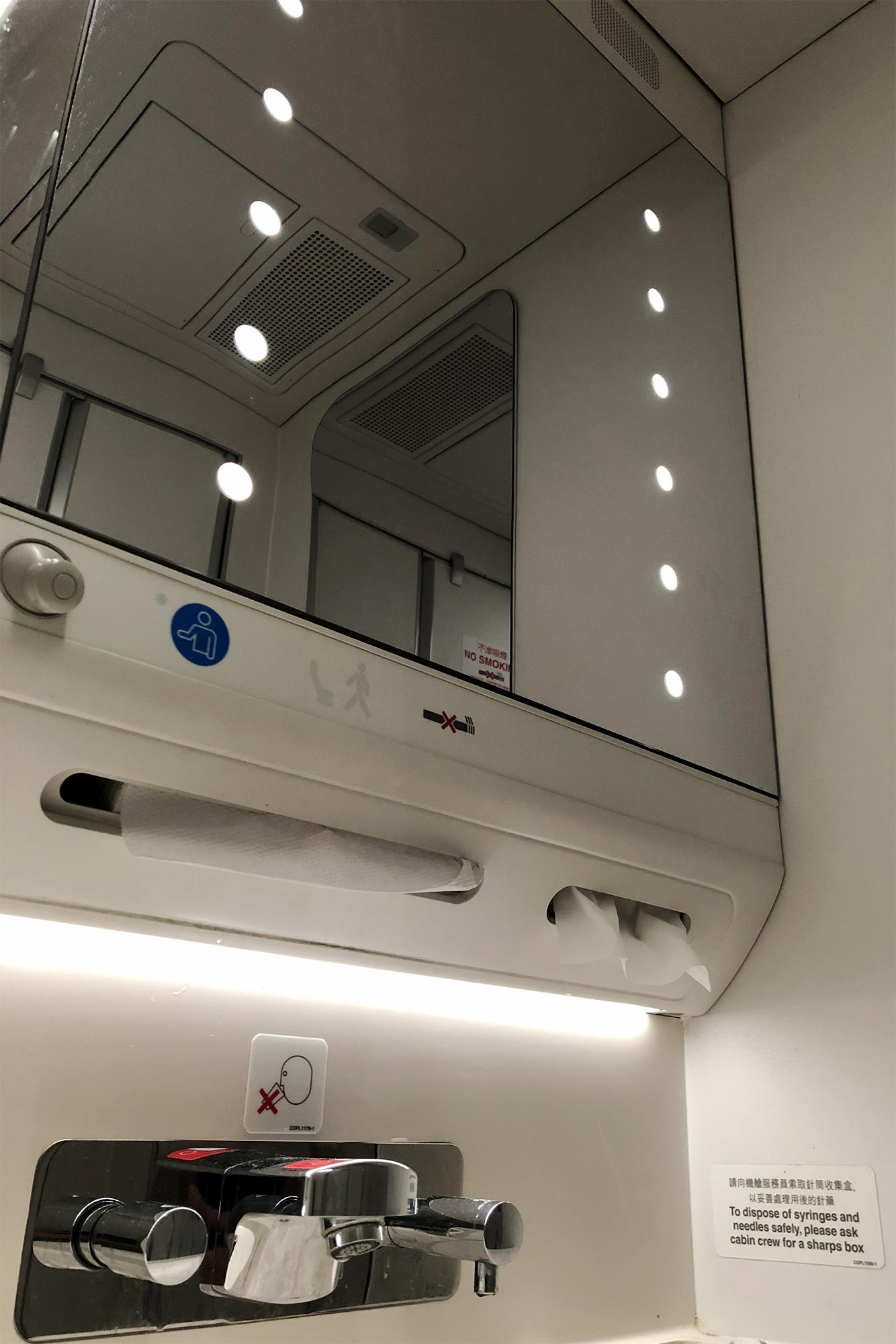 We found the toilet on this aircraft to be small but functional with a smart design and nice backlit mirror. The wall was a bit dusty which was unfortunate to see, but otherwise cleanliness was good.