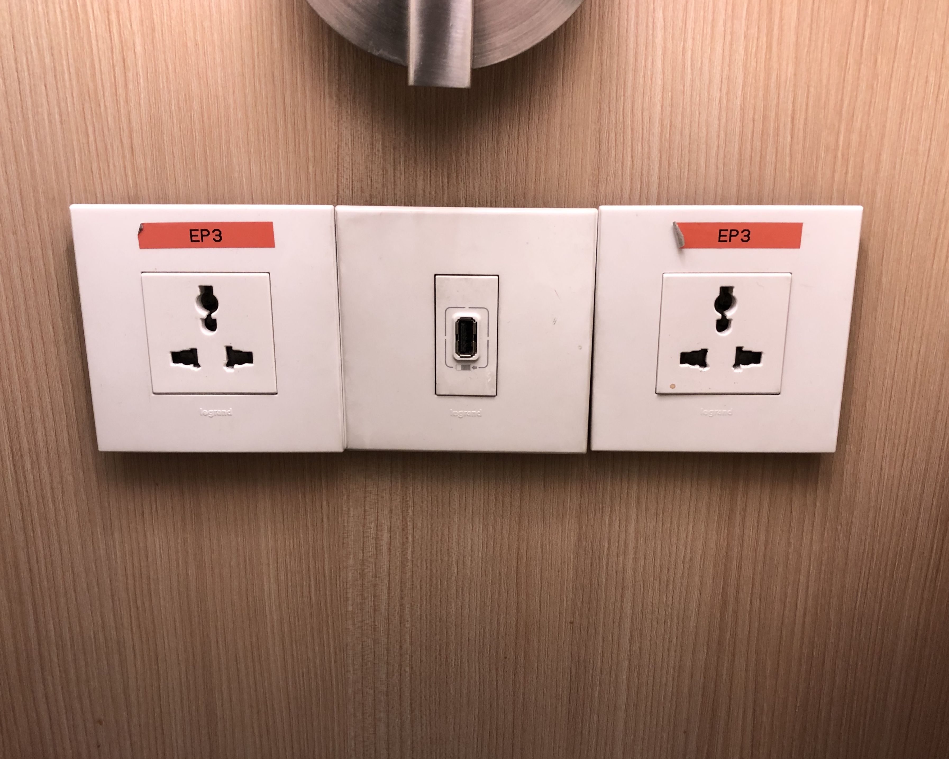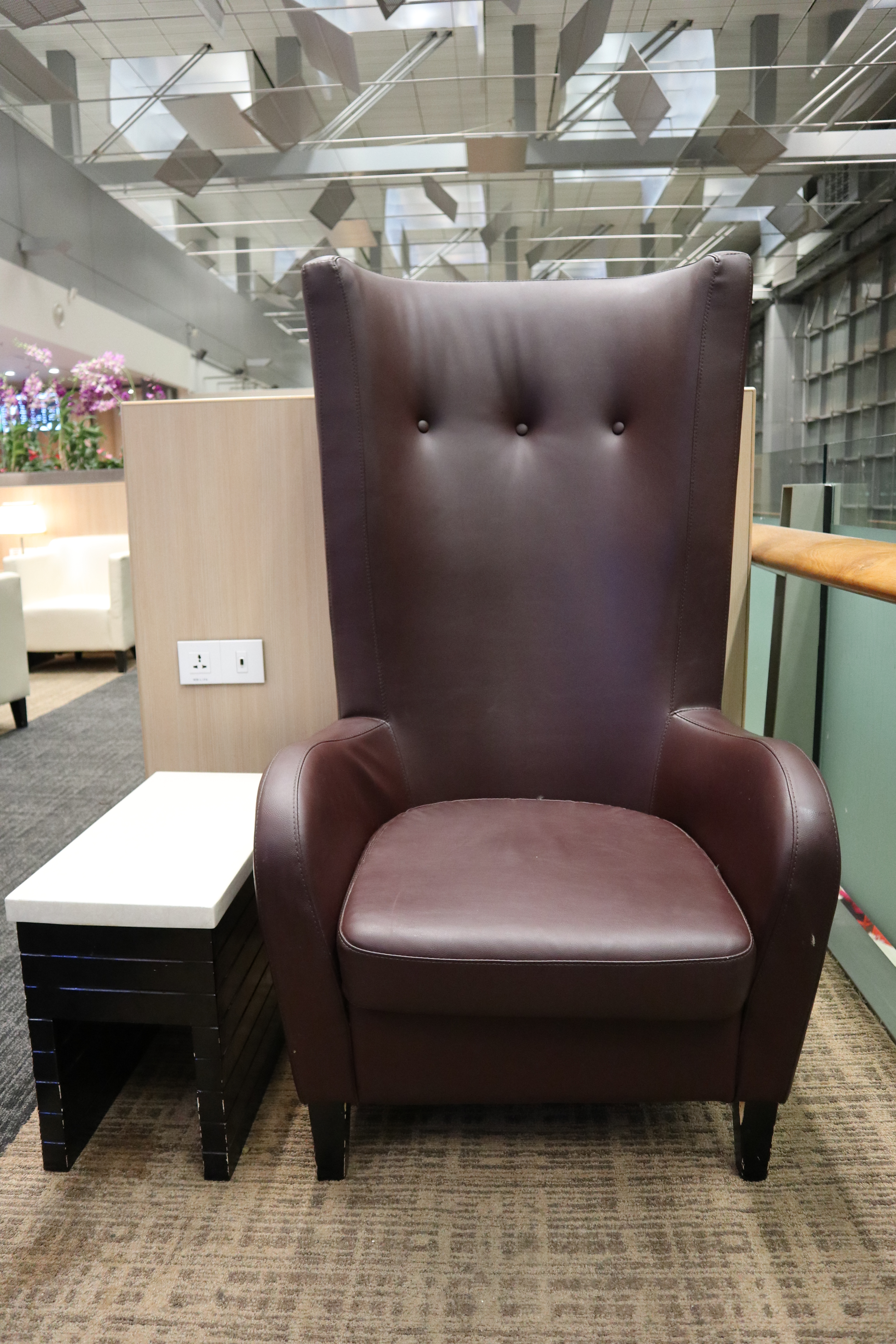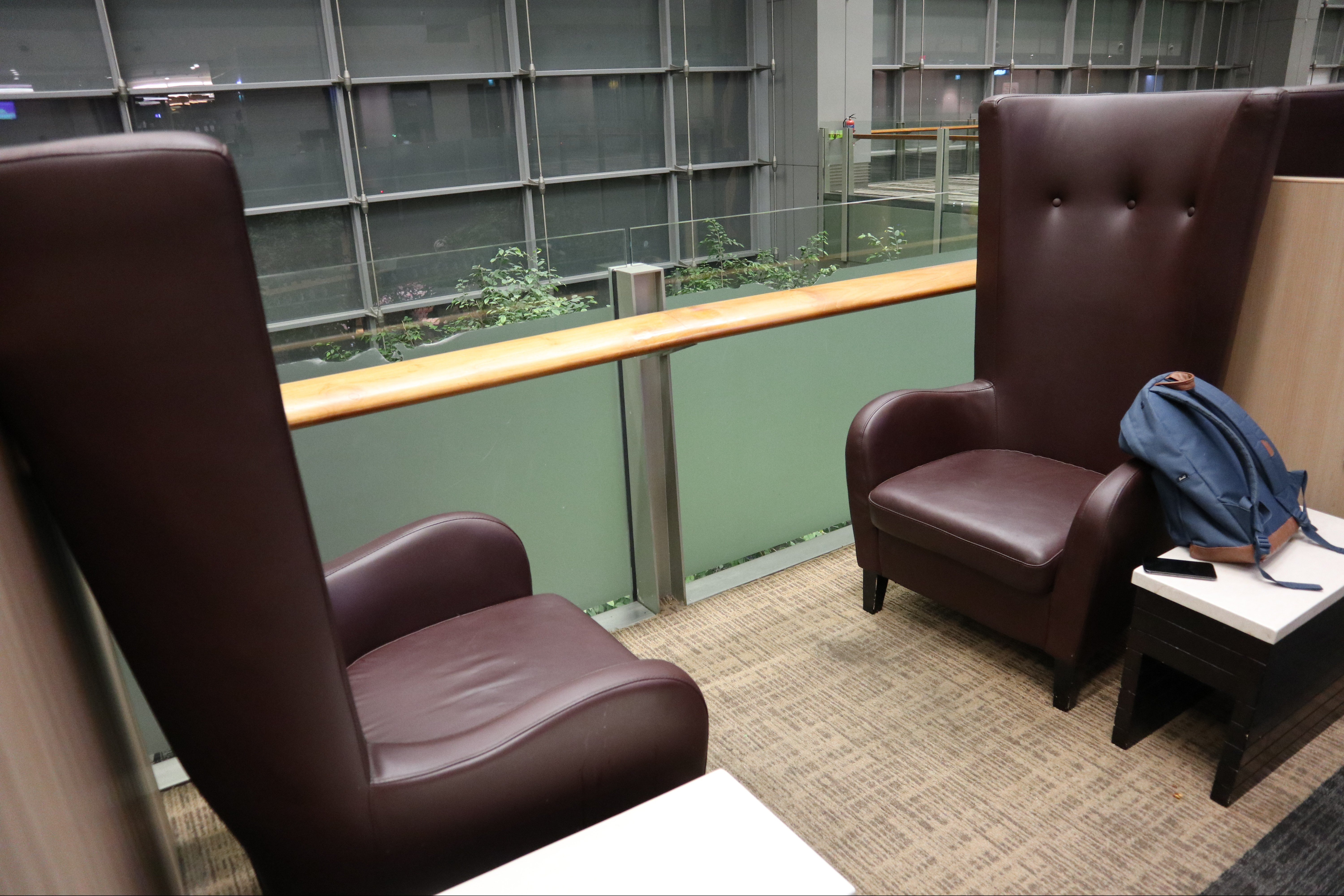 Along the back edge of the lounge there are pairs of high wingbacked armchairs. These are again equipped with USB power and multi-standard plug sockets. They are located on the balcony of the mezzanine level overlooking the main departures level – so they may be noisy at peak times.