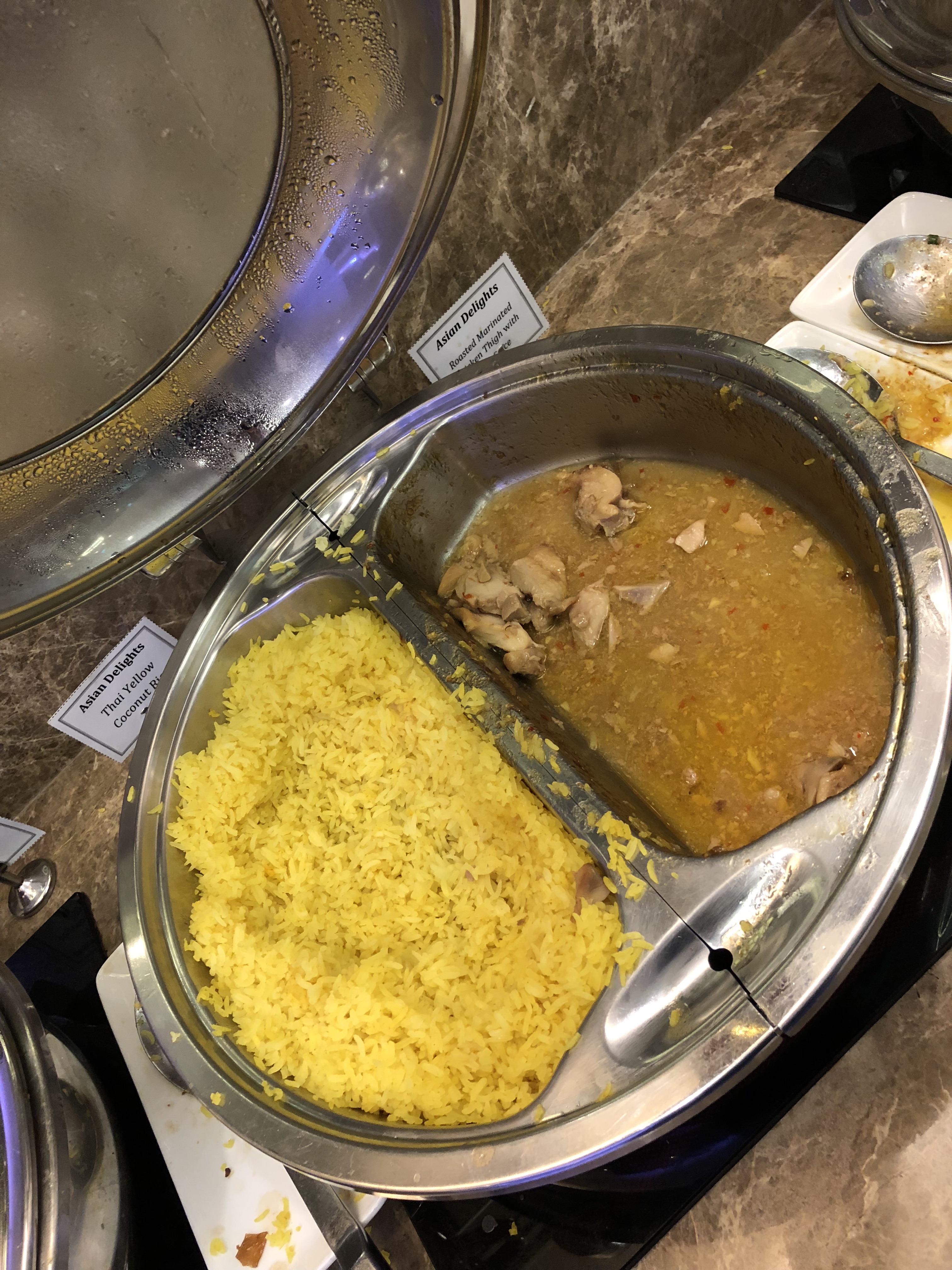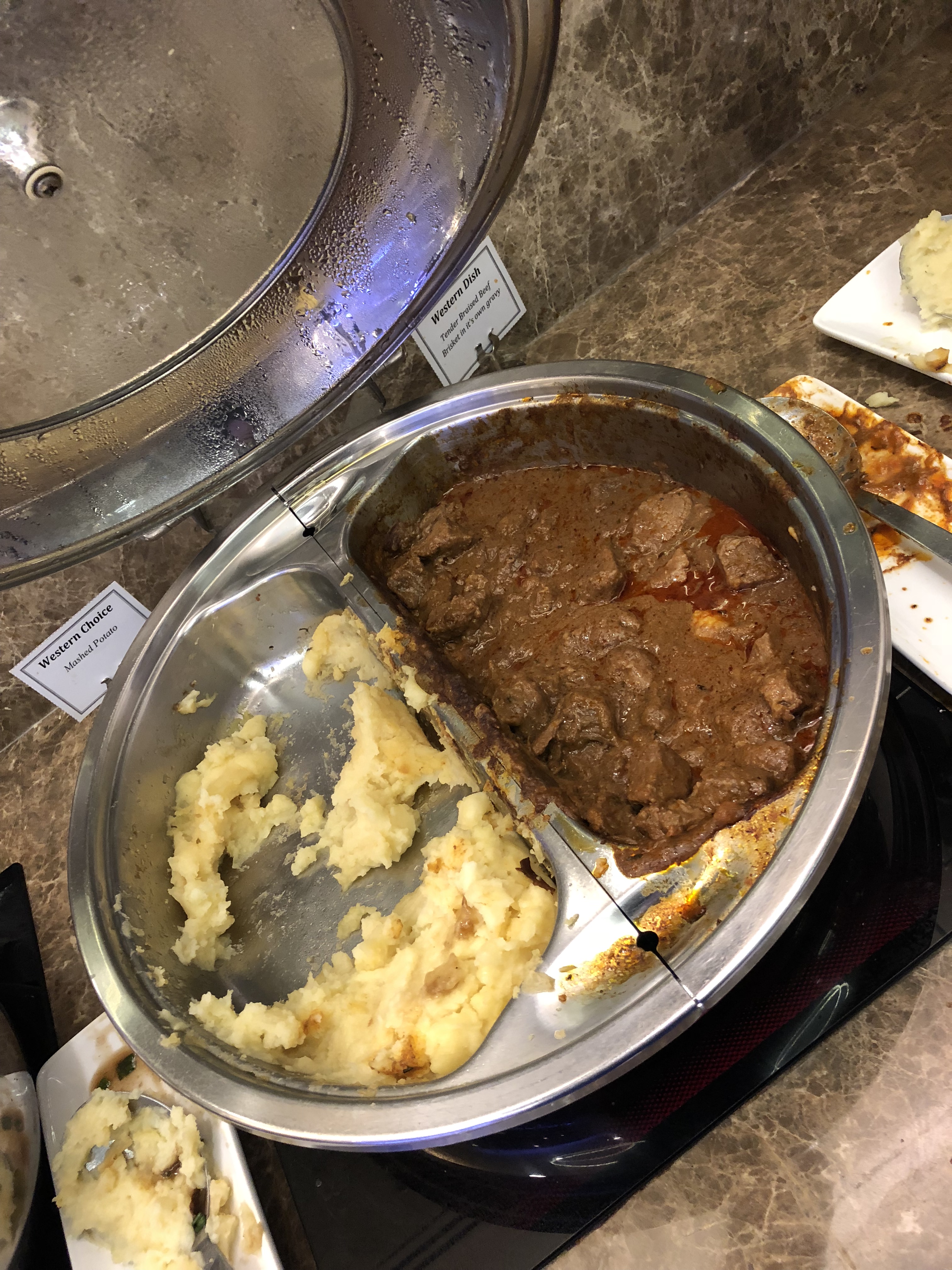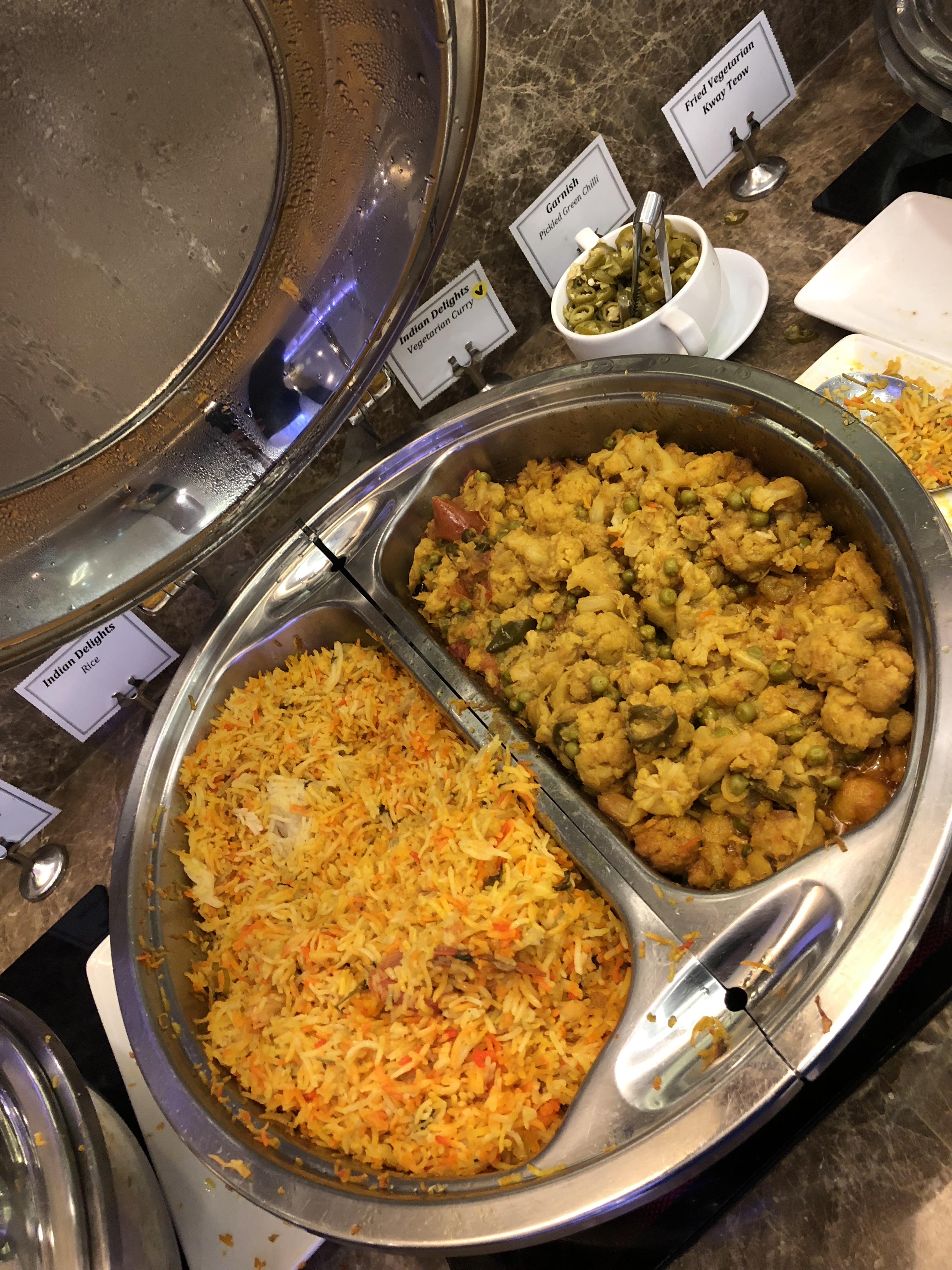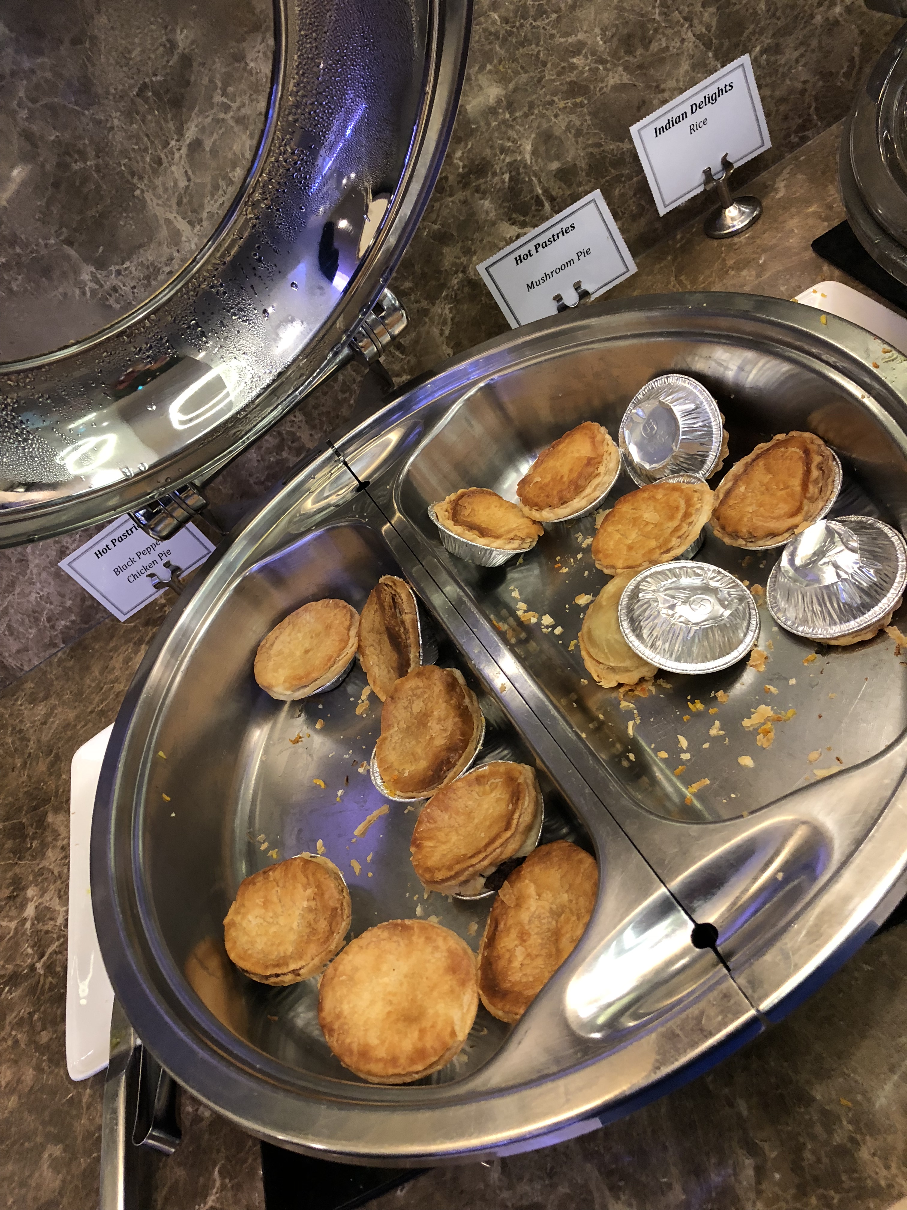 The hot food selection is a mix of international cuisine. Small hot pies, Indian vegetable curry, Chinese noodles and vegetables, Chinese chicken with rice and a western-style stew with mashed potato. We tried the Indian curry – it was fresh and flavoursome.