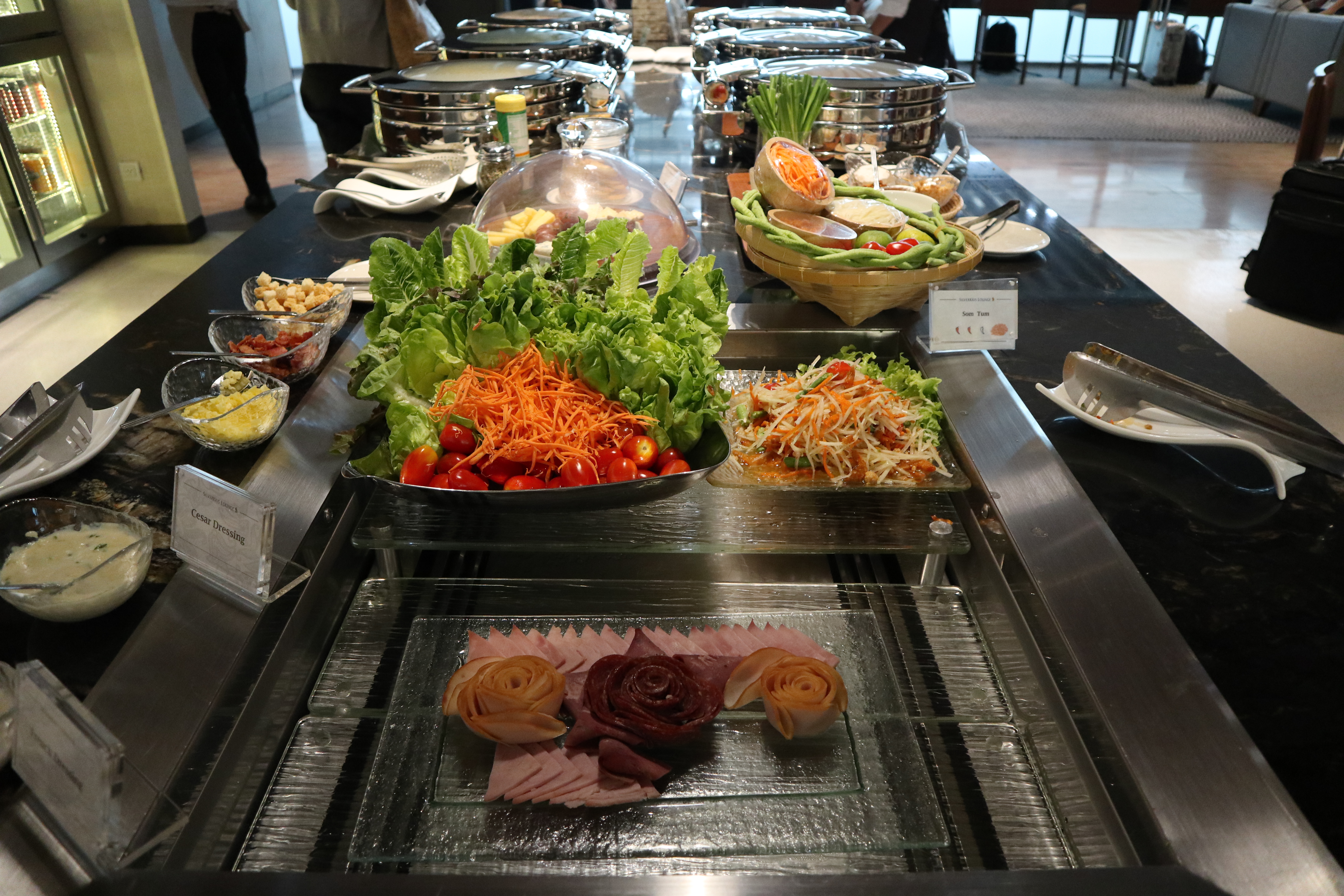 A wide selection of hot and cold options is on offer. Thai and Singaporean options include curries and soups. There are sandwiches, cold meats, salad and dessert options.