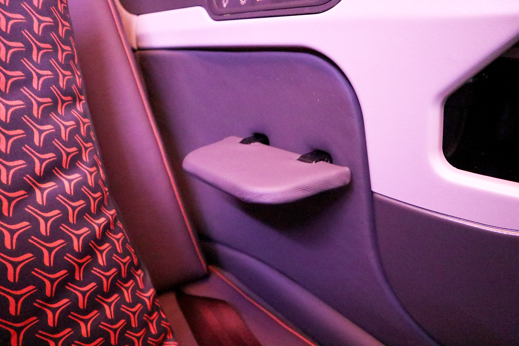 At the back of the side table there is a handy pocket-sized stowage for storing your mobile phone, which is also equipped with a USB charging socket. It’s worth mentioning here that the side tables in the middle D/F seats are noticeably wider than at the window A/K seats (see below, side table at seat 97A on the left, and at seat 96F on the right).