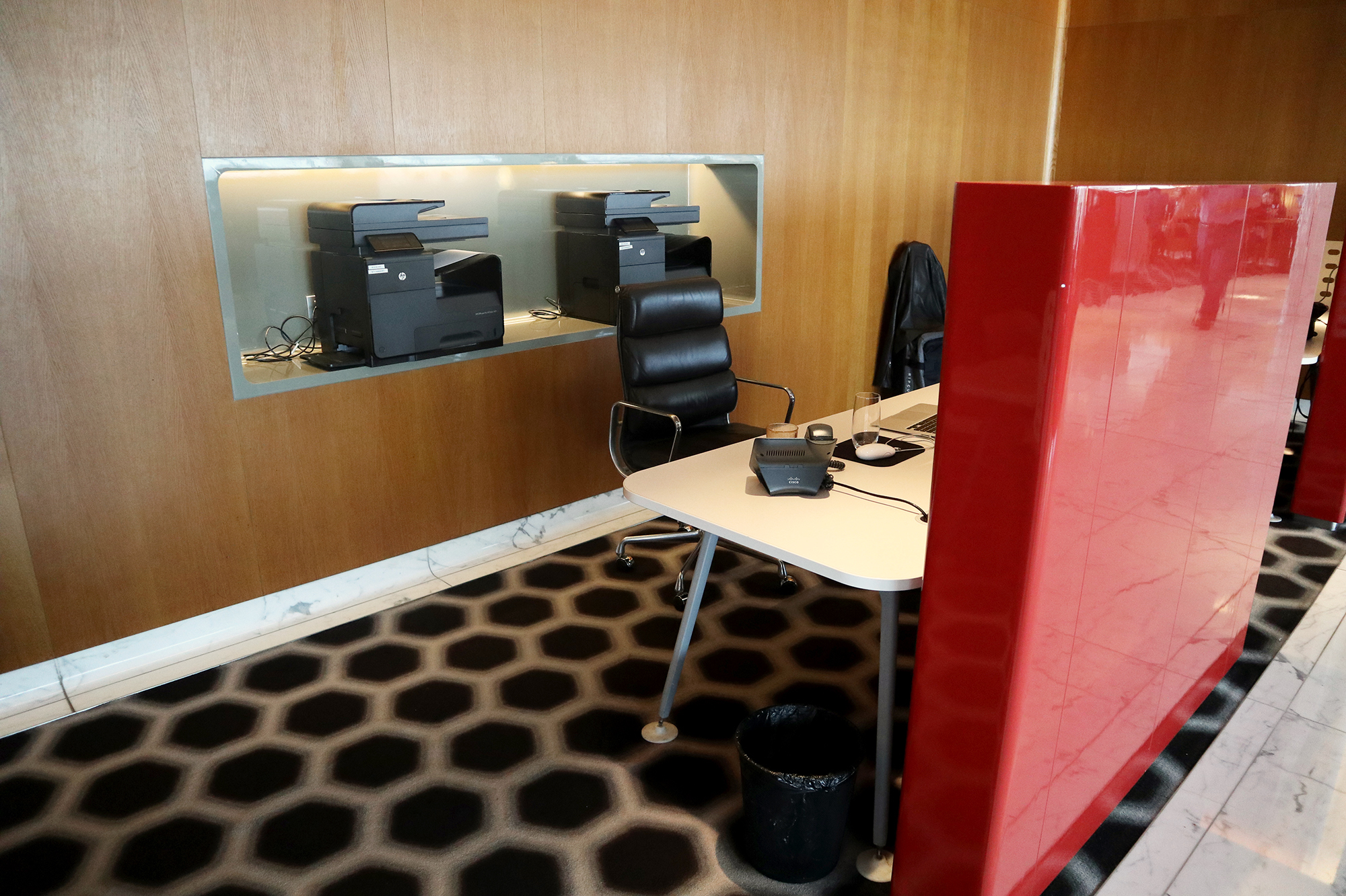 Towards the far right side of the lounge, there are also meeting rooms available, which can be pre-booked or you may be lucky and be able to secure one on the day. Each is equipped with a large working desk with two chairs, an iMac, TV, sofa and armchair as well as a printer and ample charging sockets.