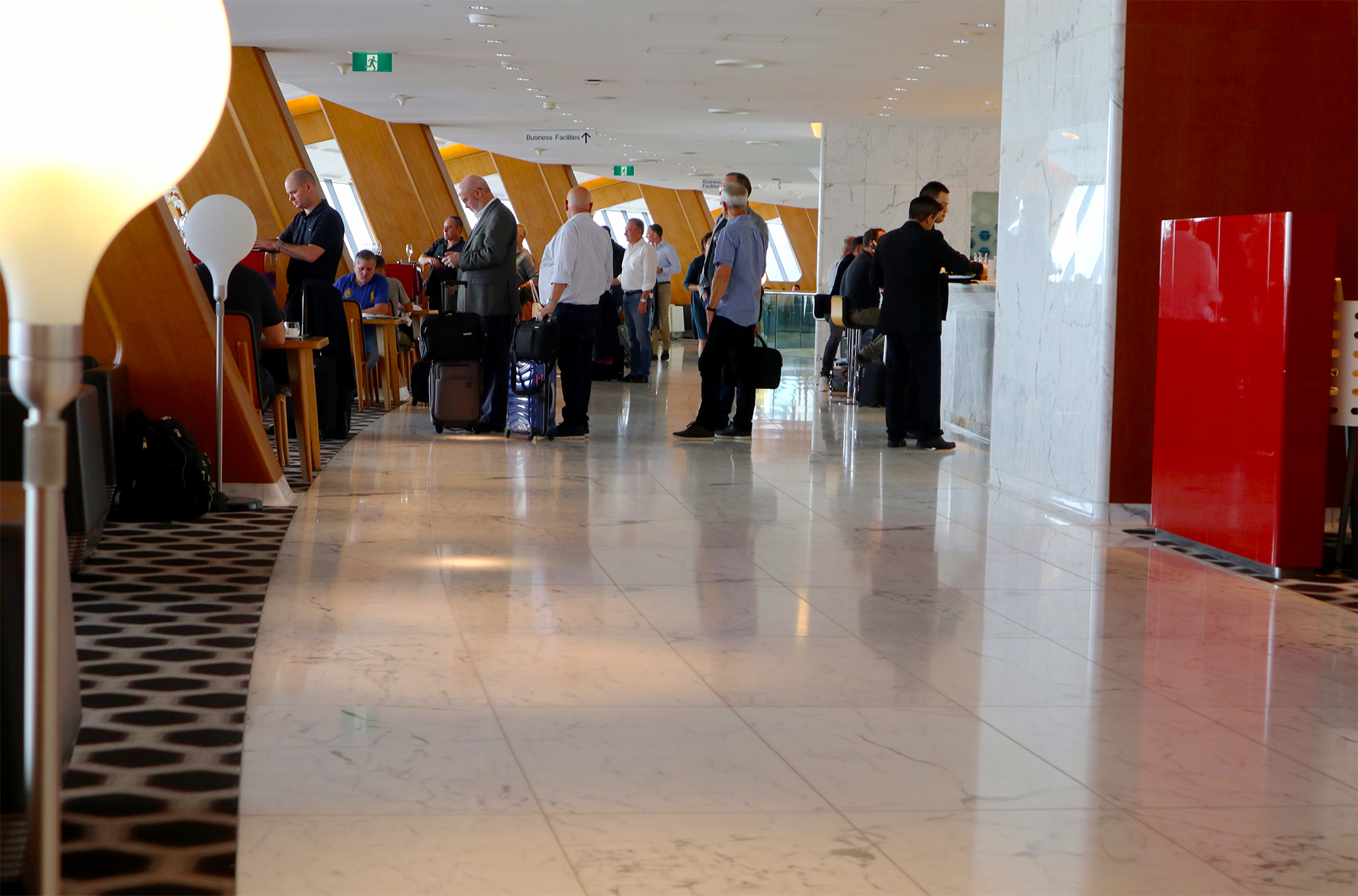 Various seating options are available throughout the lounge to suit various user requirements. Dining areas have sensibly sized tables and upright wood and leather chairs. Red and brown ‘easy chairs’ are situated in banks. Some of these face out towards the aircraft parking area and consequently are the most coveted and slightly worn.