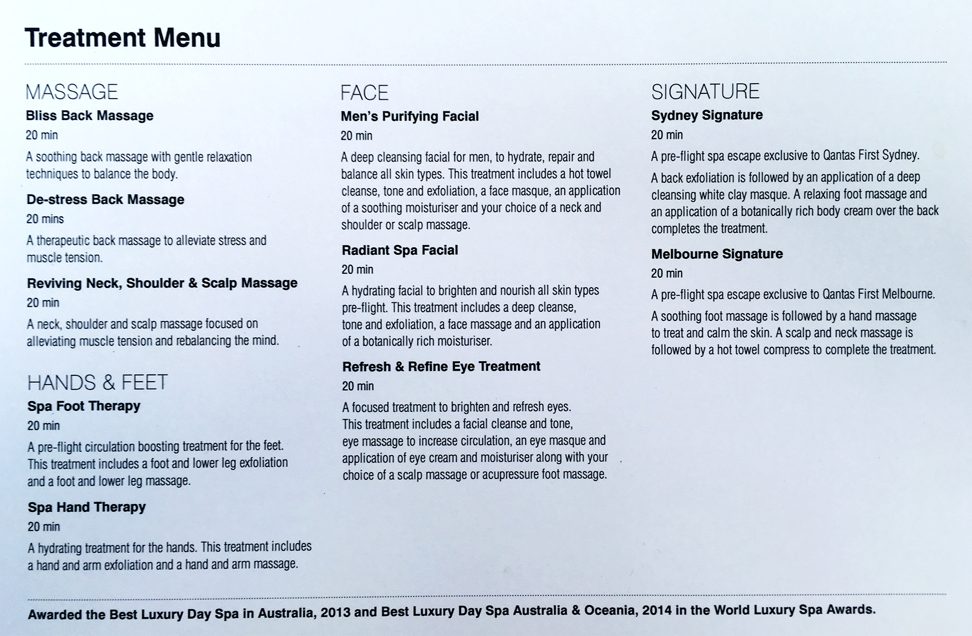 We were initially concerned that this might not work as we did not book directly with Qantas, instead using our British Airways Avios points to redeem our first class tickets on the A380 Sydney to Singapore flight. However it was no issue and they telephoned around 1.40pm the day before our departure from Sydney, allowing us both to book in for a 9.30am treatment the next morning.