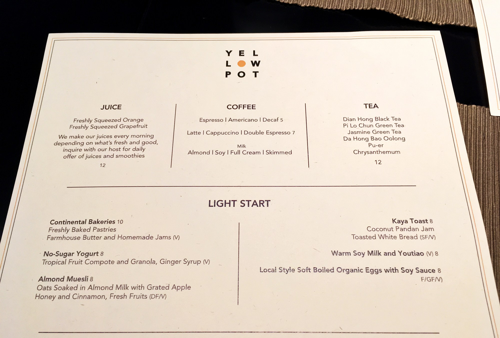 Served in Yellow Pot, breakfast is available from 6:30am to 10:30am. It’s an à la carte affair and the first part of the menu is focused on juices, tea, coffee and lighter options. We both started with a cappuccino – which was excellent.