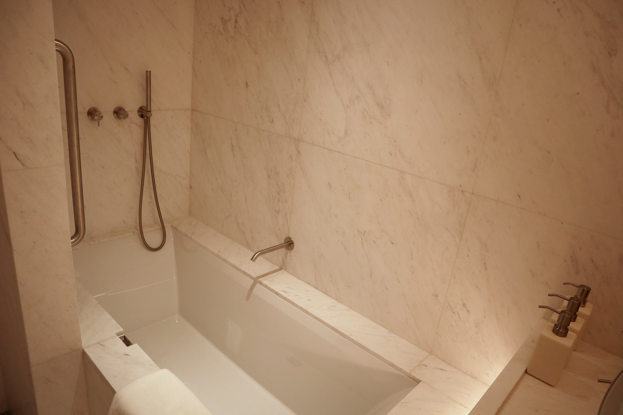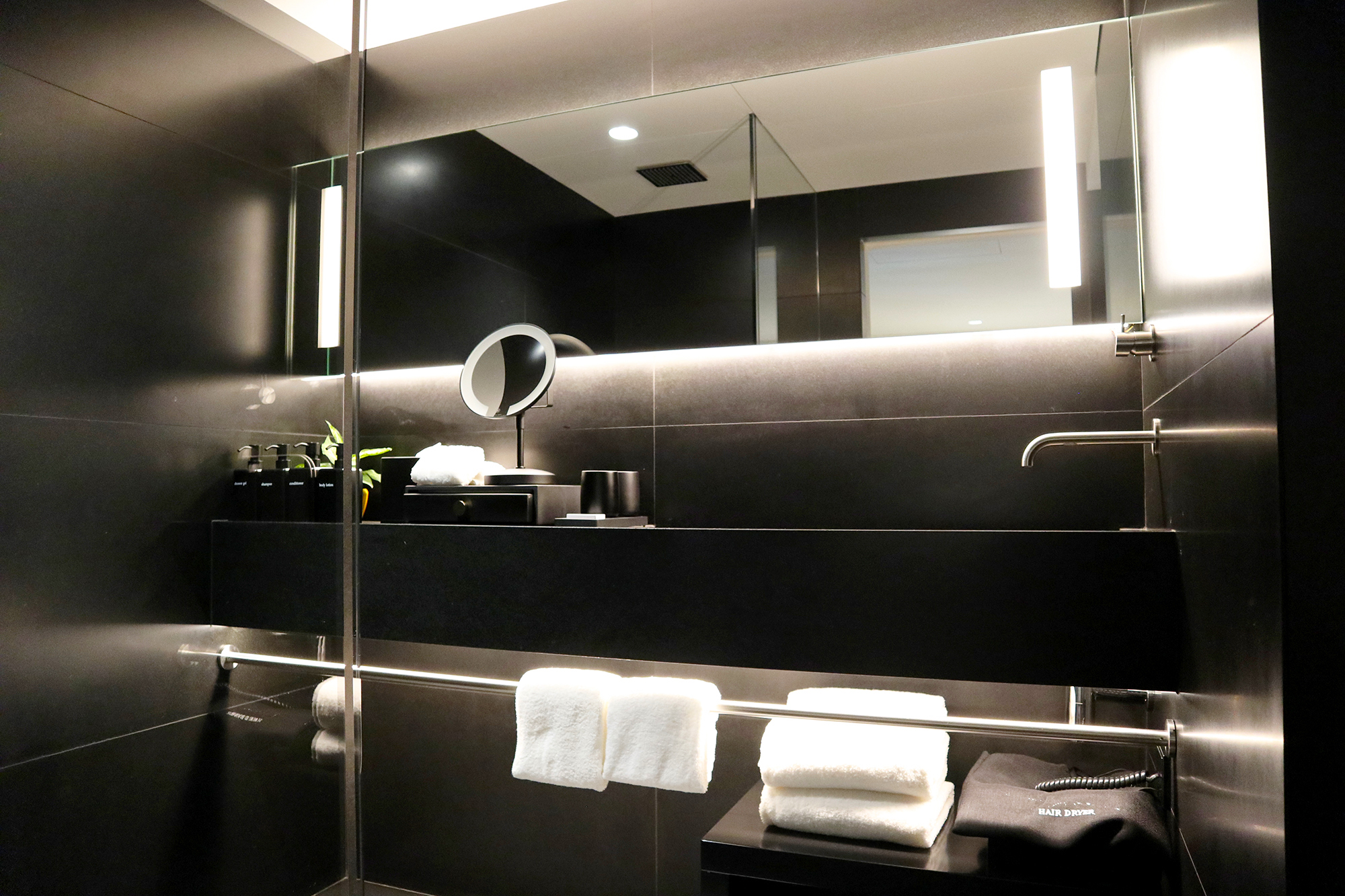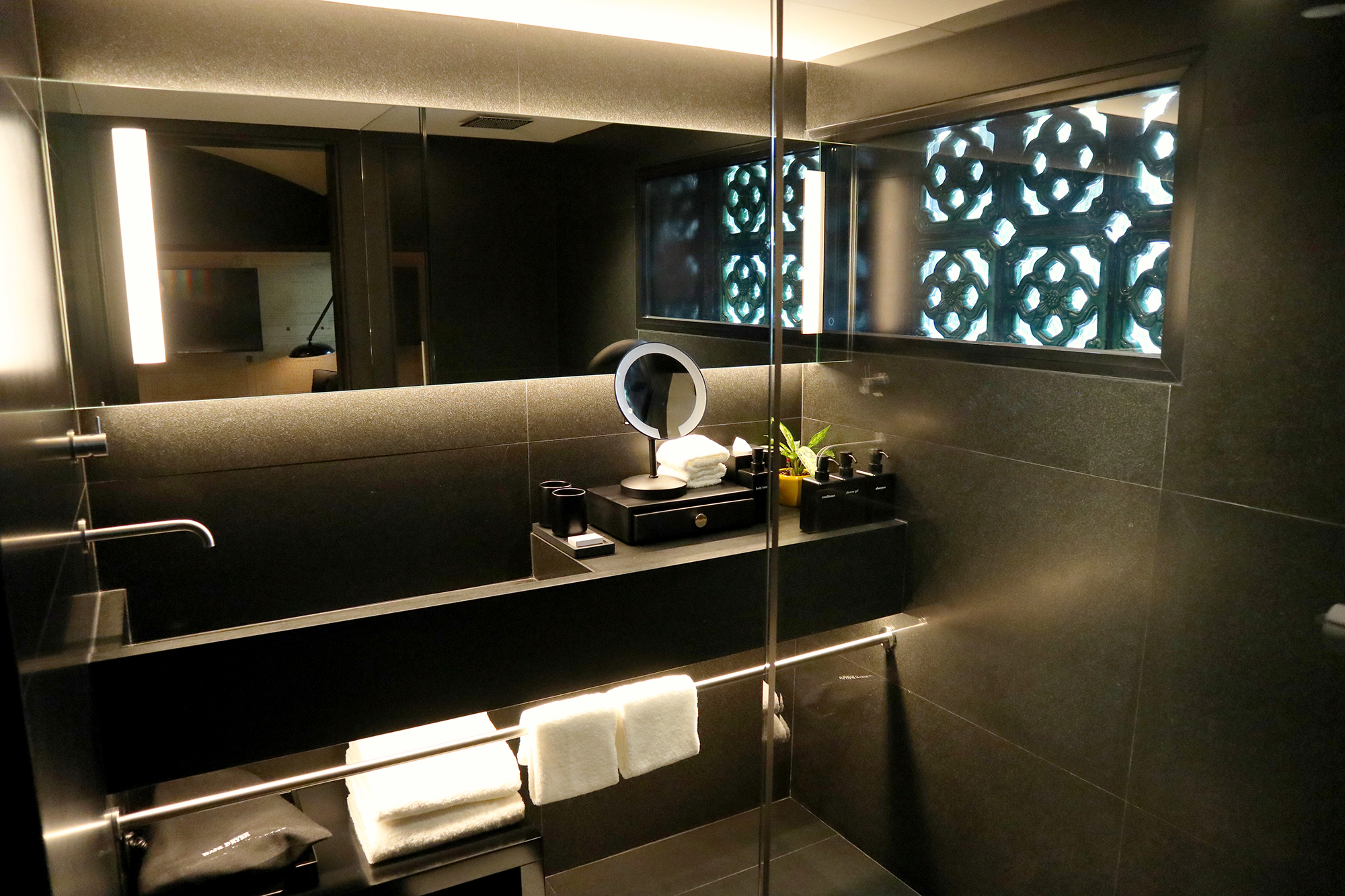 A heated mirror runs along the back wall opposite a full-length rain shower. Interestingly – there’s no bathtub. In fact, only one room type at the hotel has a bath: The Pearl Suite. More on that room later.