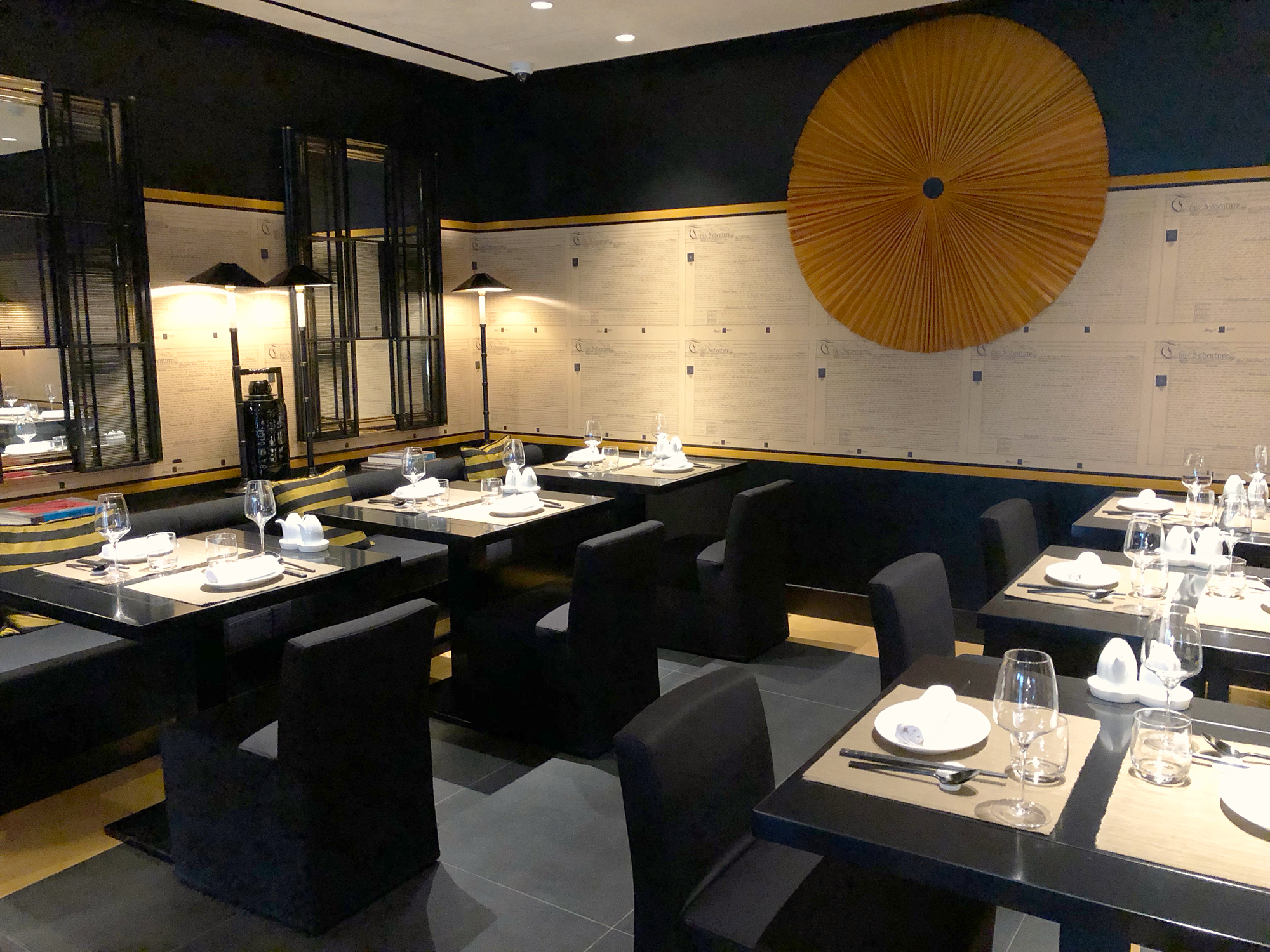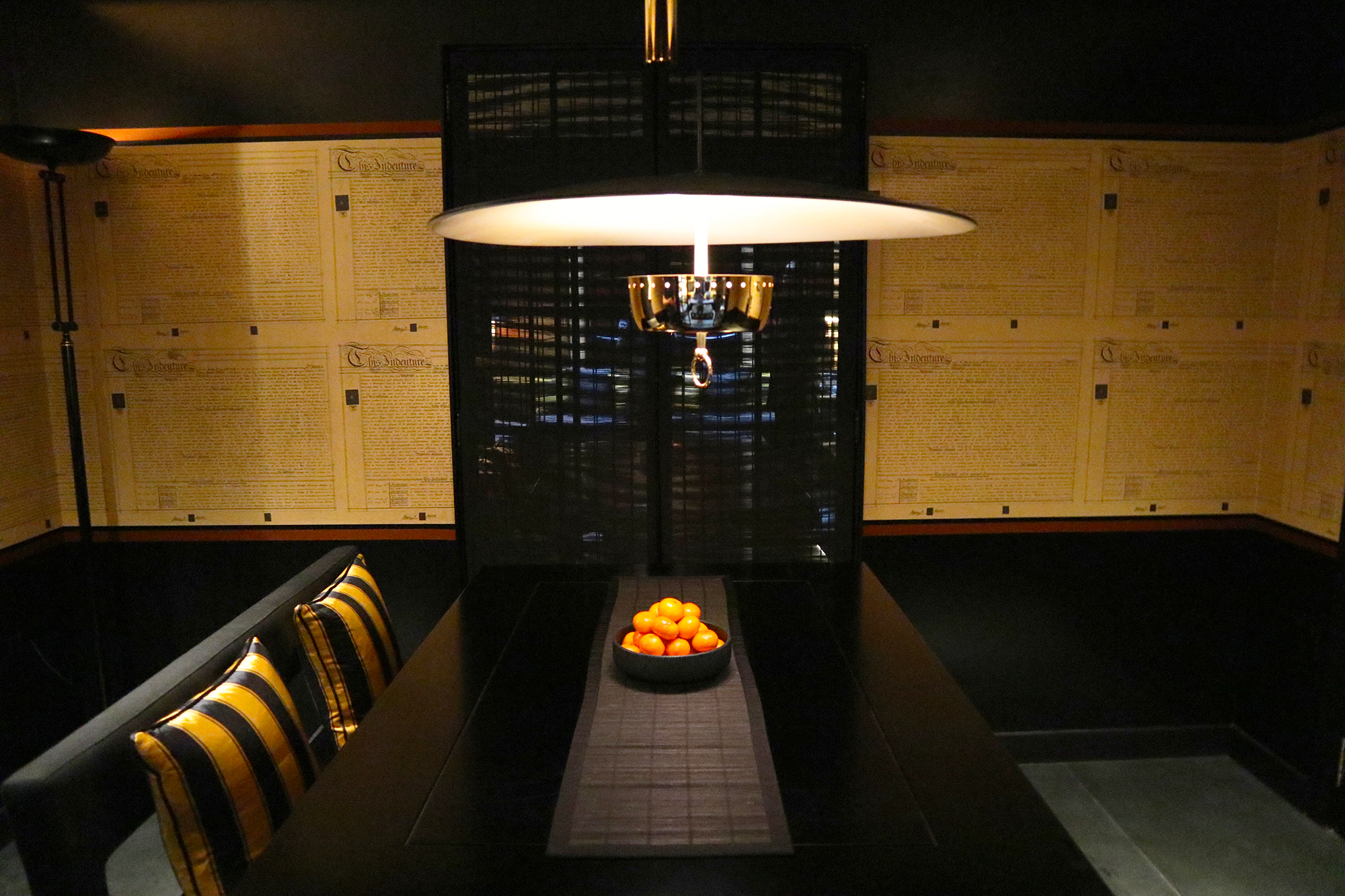 The lobby continues the theme of dark wood mixed with Chinese accent lamps. Yellow / gold against black is the main accent colour here, with green palms breaking up the palette.
