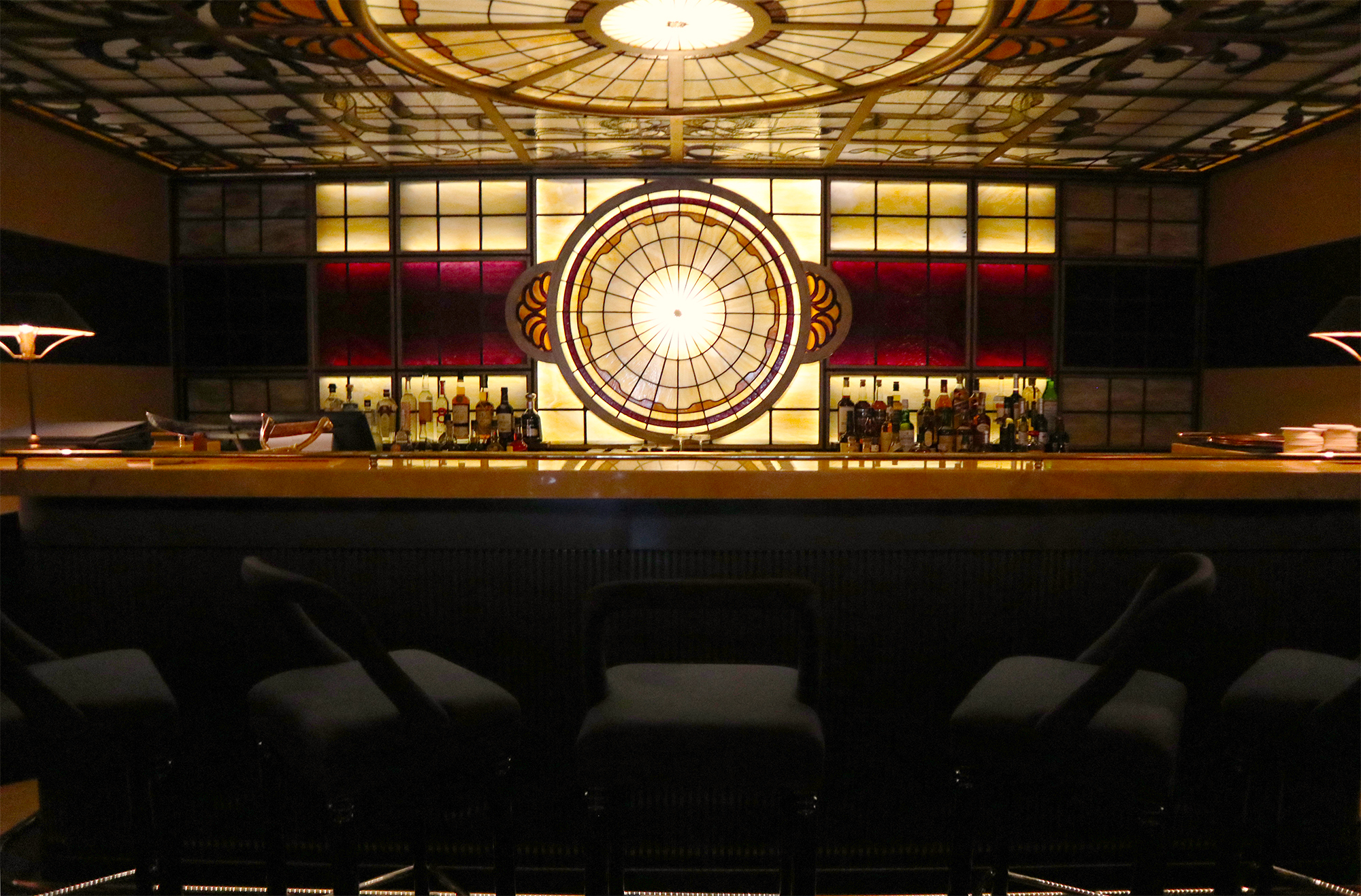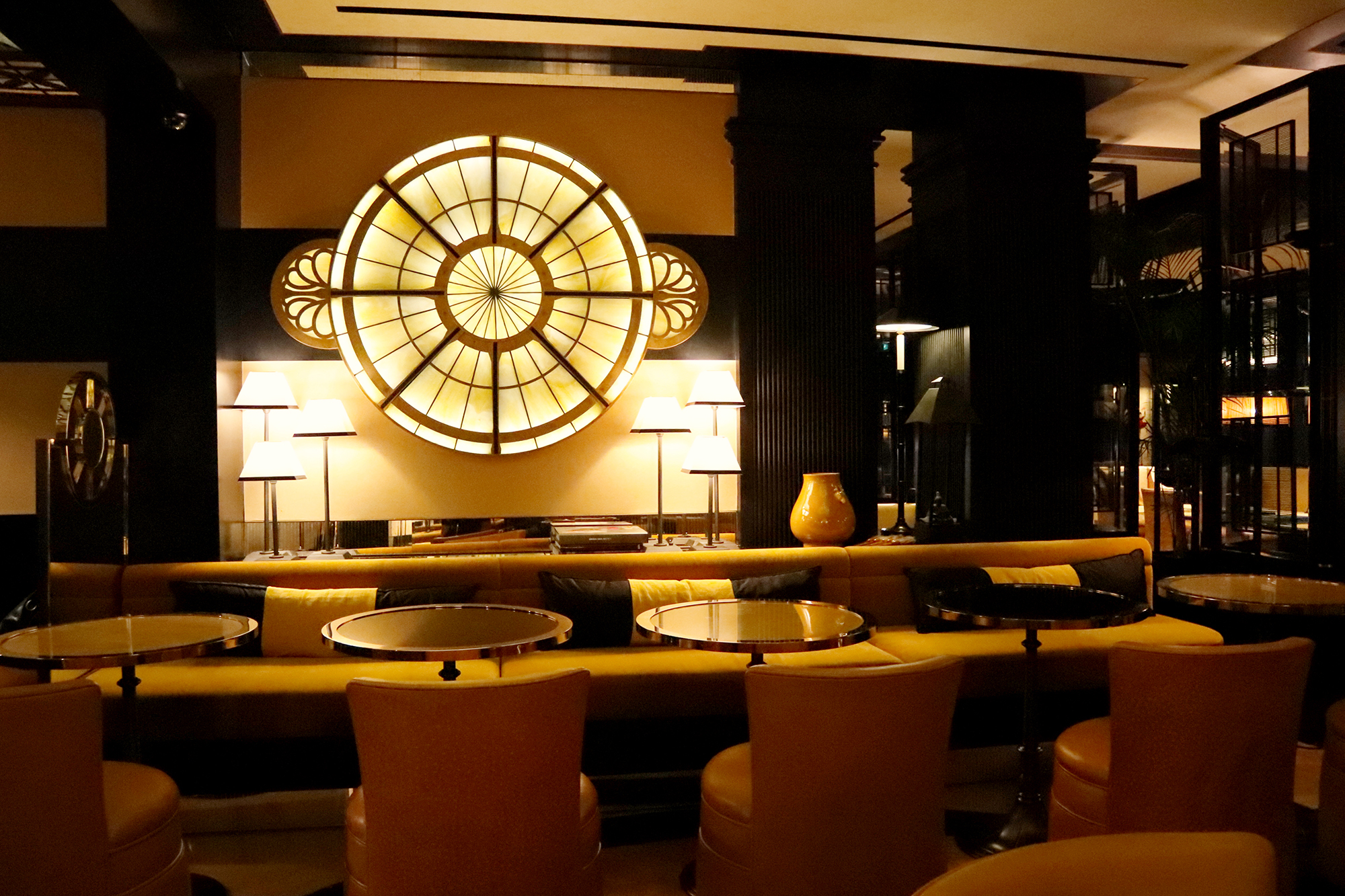 Through the lobby is the Yellow Pot bar. Art deco glass lights, ostrich leather chairs and velvet bar stools create a retro-modern feel.