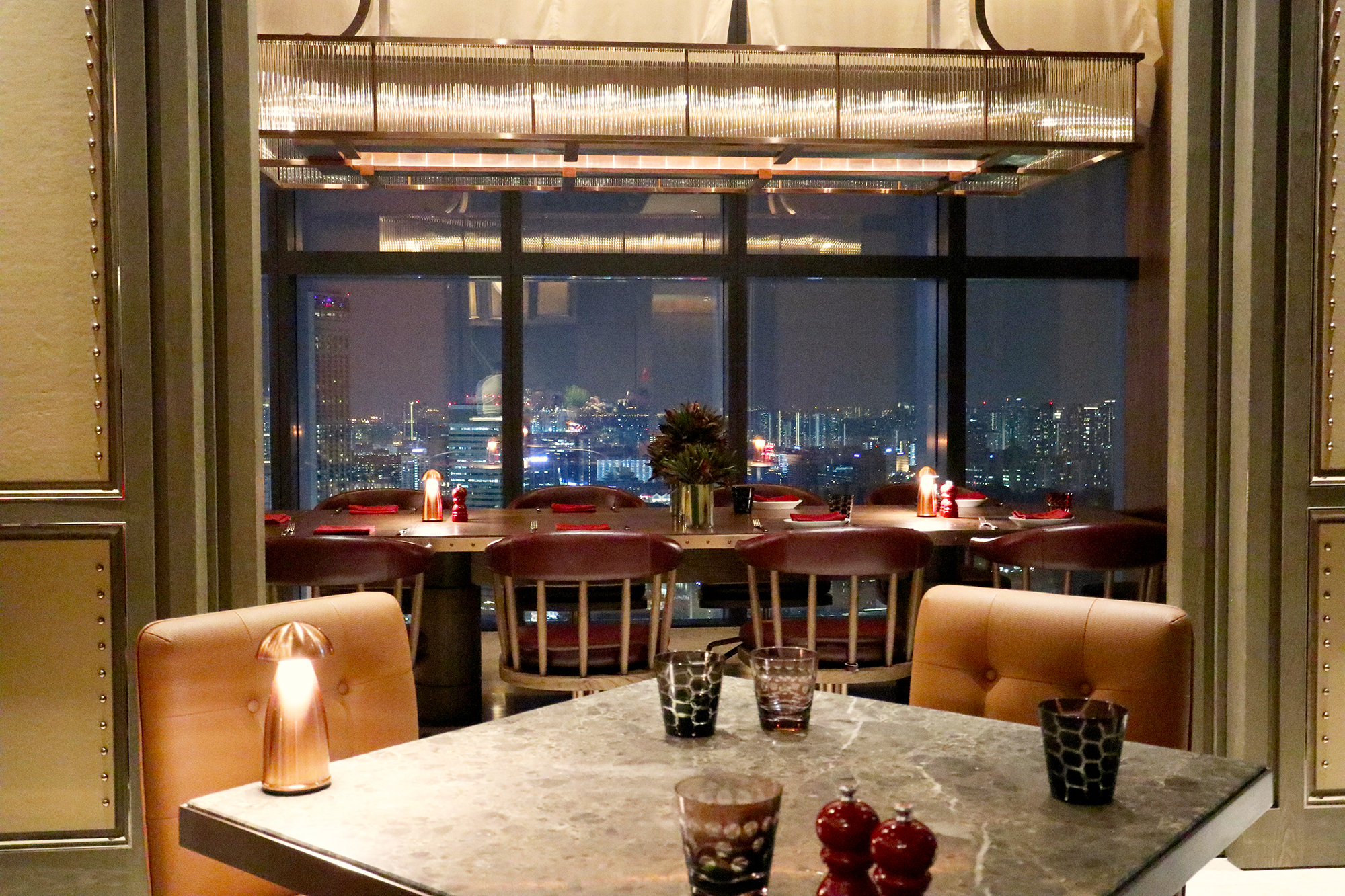 A steakhouse situated on the 38th floor flanked with floor to ceiling glass windows exhibiting yet another stunning vista of the Singapore skyline.