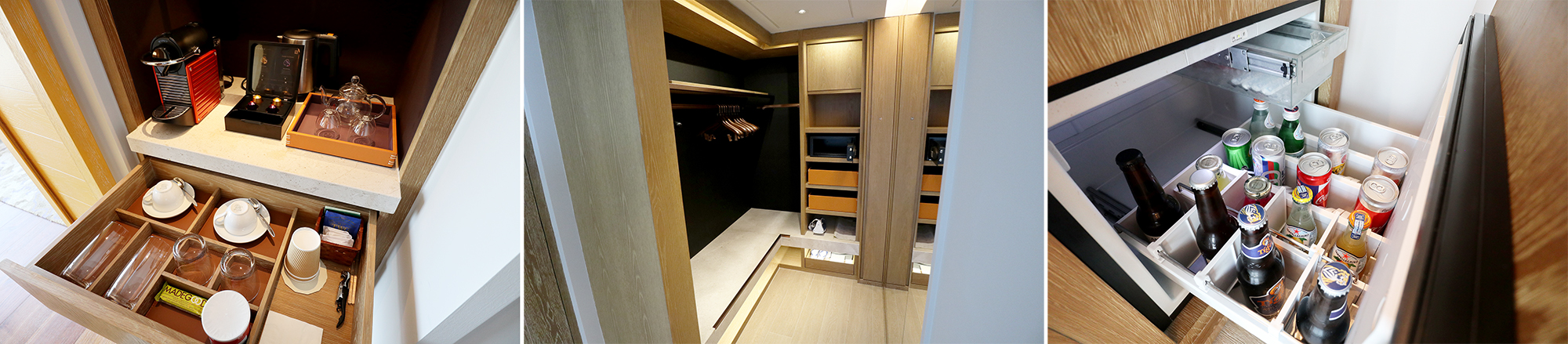 Located on the corners of the building, the room begins with a foyer, a sizeable wardrobe/dressing area plus the mini-bar, which is well stocked. Non-alcoholic items are free of charge and topped up daily.
