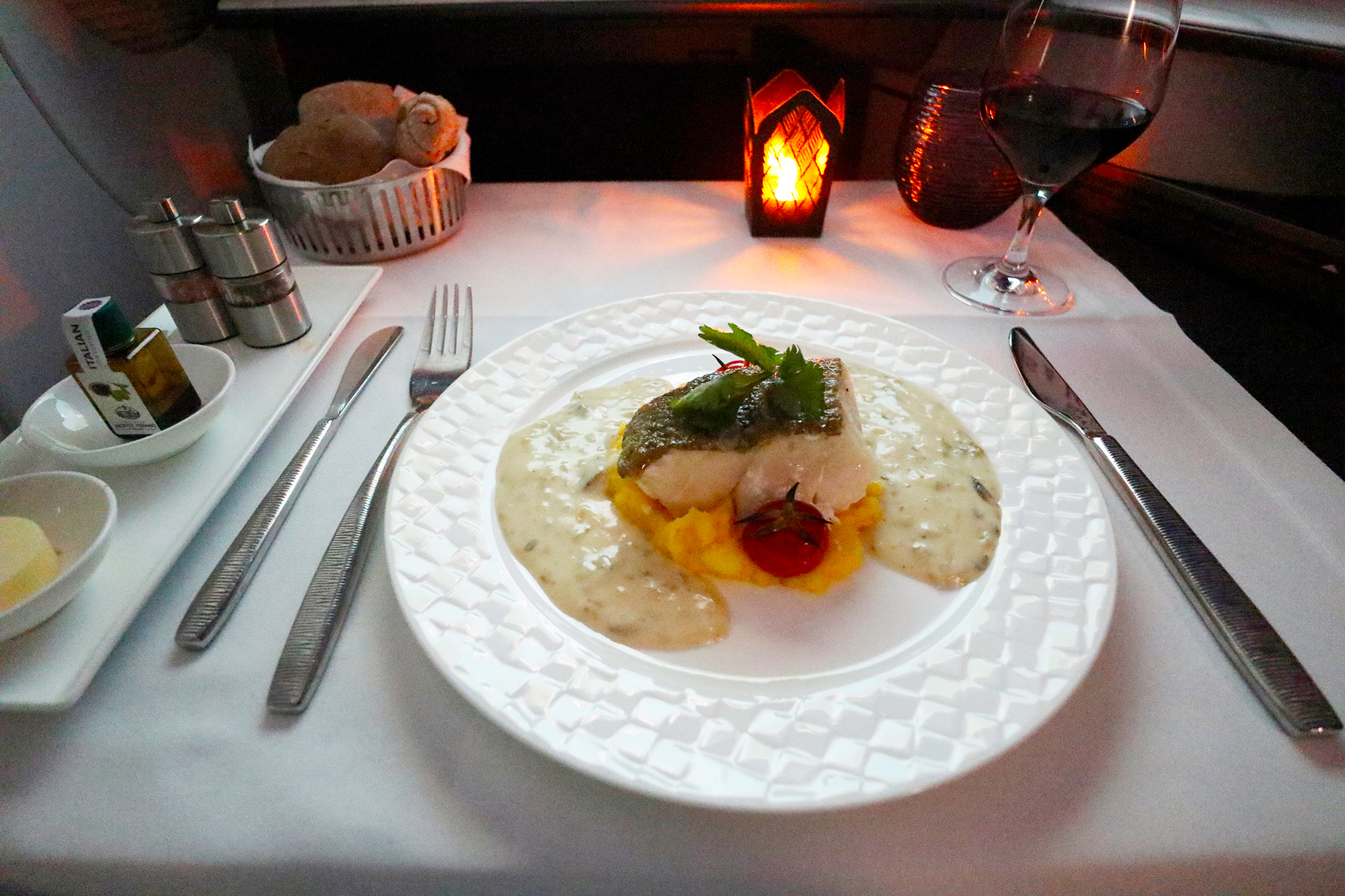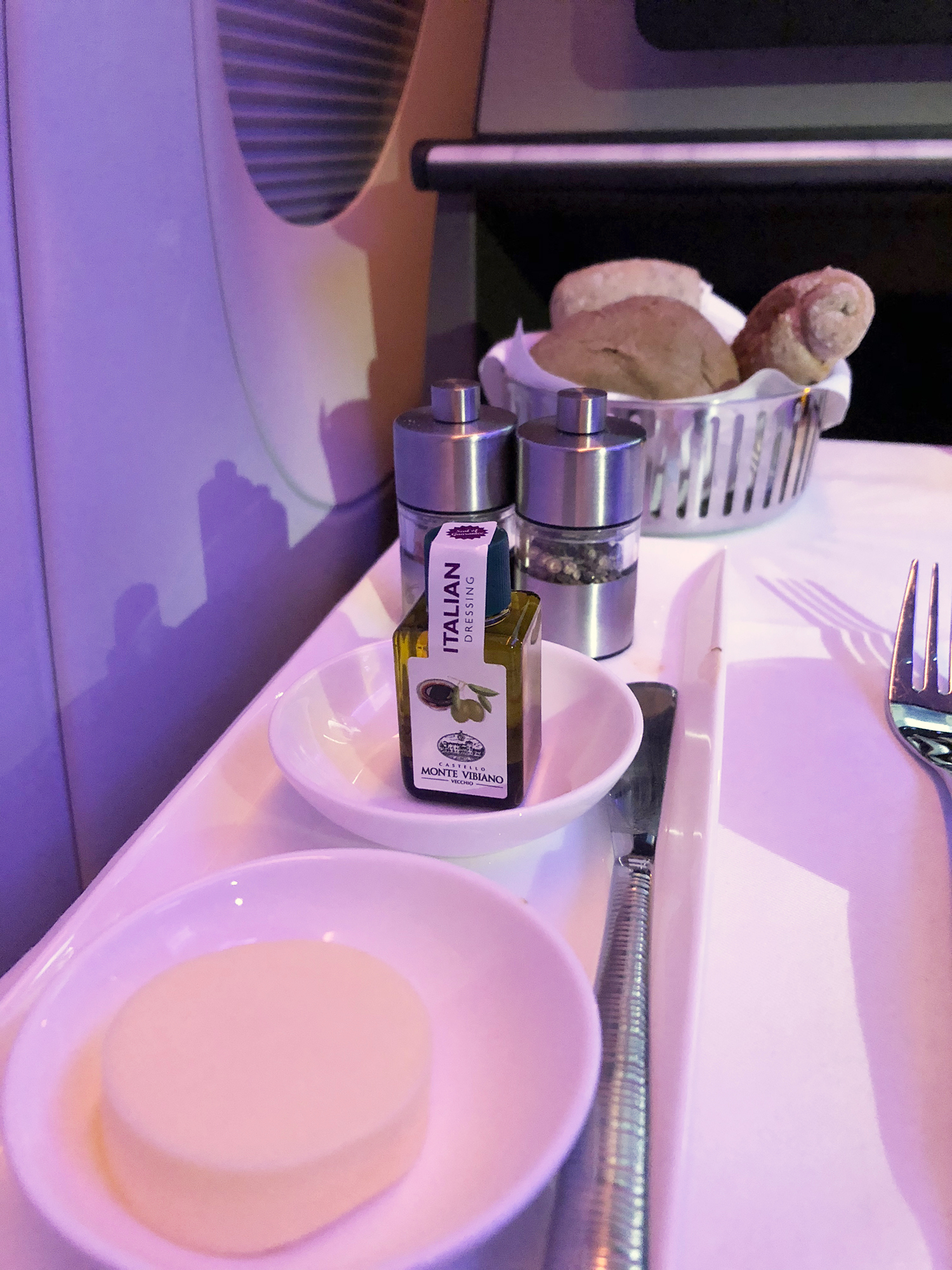 The whole food situation was unfortunately a bit of a disaster from start to finish and left me wishing I’d eaten more in the lounge in Frankfurt. Though I did genuinely try to make the best of a bad situation, the fish I didn’t want was bad. The mezze starter was wonderful but accompanied by hard stale pita bread. Dessert wasn’t even offered, the crew seemed more keen to clear the table.