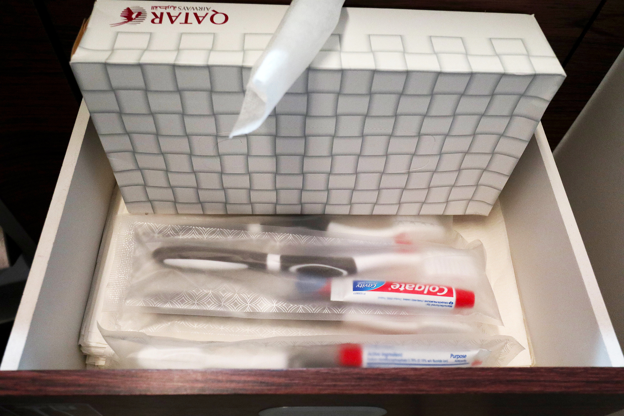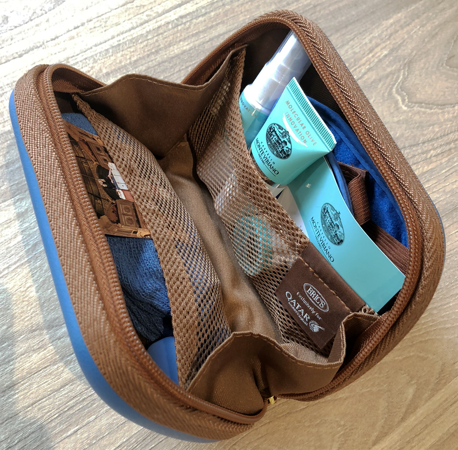 The amenity kit comes in an attractive BRICS toiletry bag. The company is a leading Italian fashion travel brand so the bag, exclusive to Qatar Airways, is a nice perk in itself.