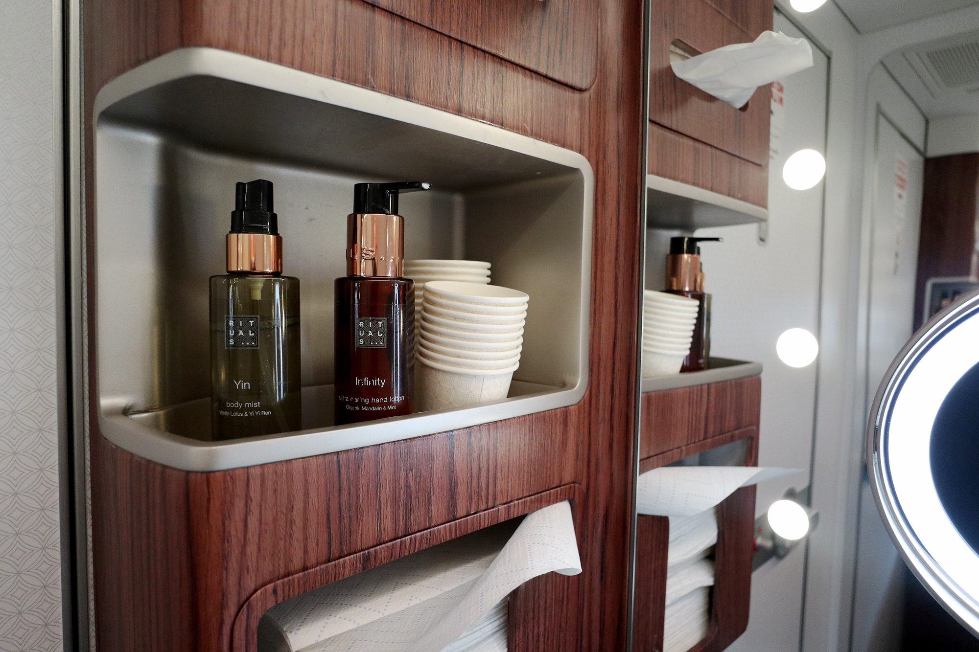 The solo window suites at the side (A/K or B/J) each have two air vents in the ceiling. If like us you appreciate these it’s important to note there are none in the middle suites (D/G or E/F). Due to the lack of overhead lockers in the middle section the ceiling is so high they would be out of reach and probably ineffective anyway.