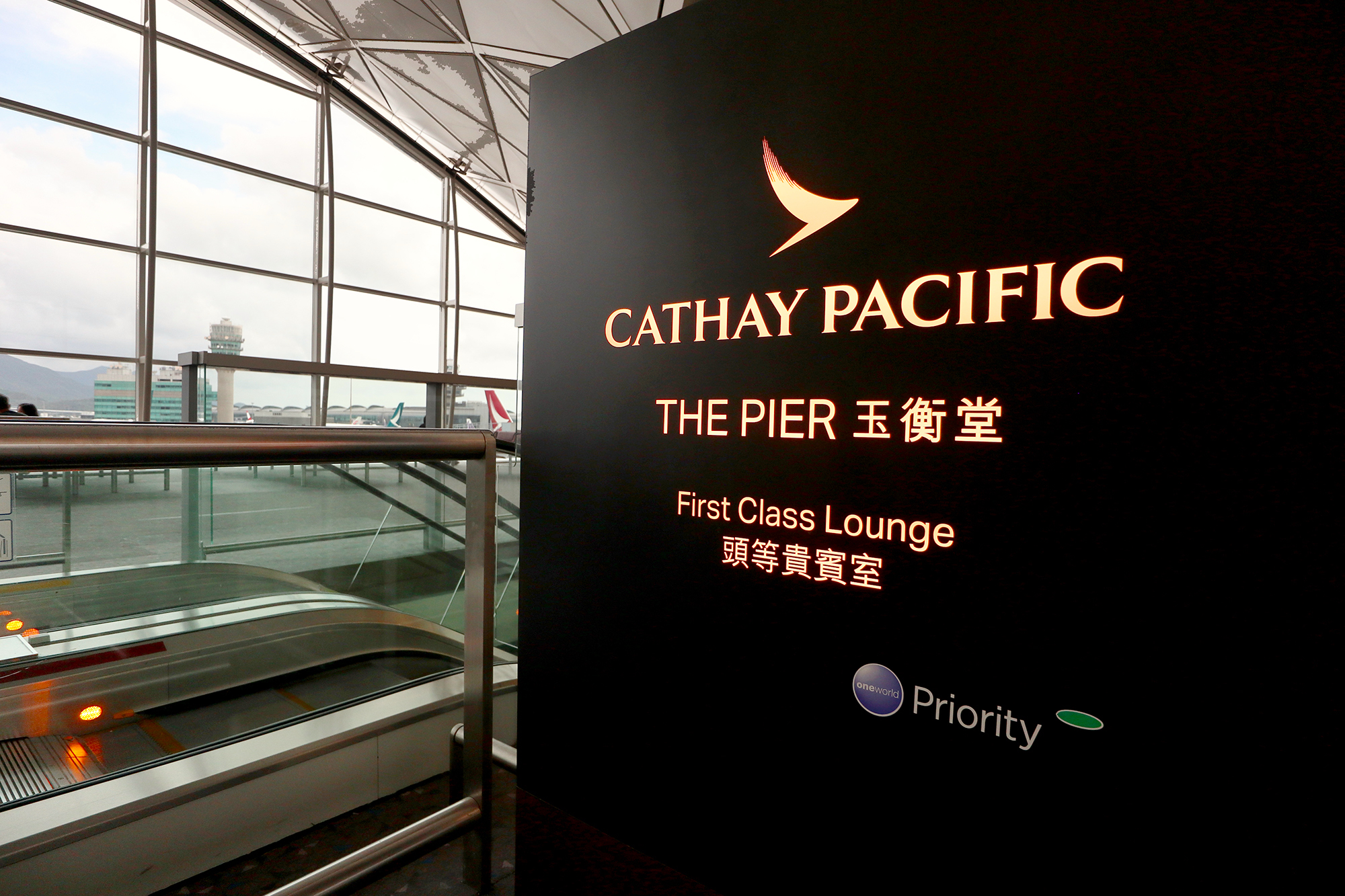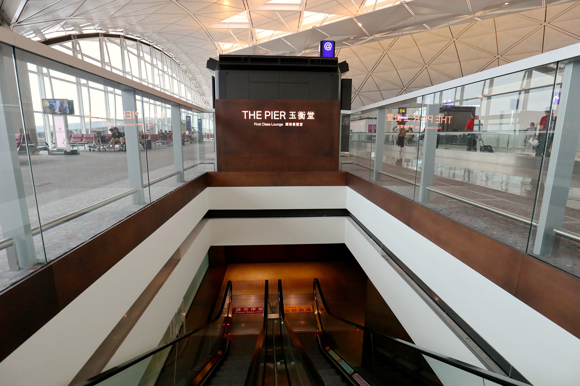 The Pier is located near gates 61 – 63 in the northwest concourse of Hong Kong International Airport. You’ll need to descend the escalator by one level, as unlike The Wing First Class lounge, which is suspended one floor above the departure concourse, The Pier is one floor below it.