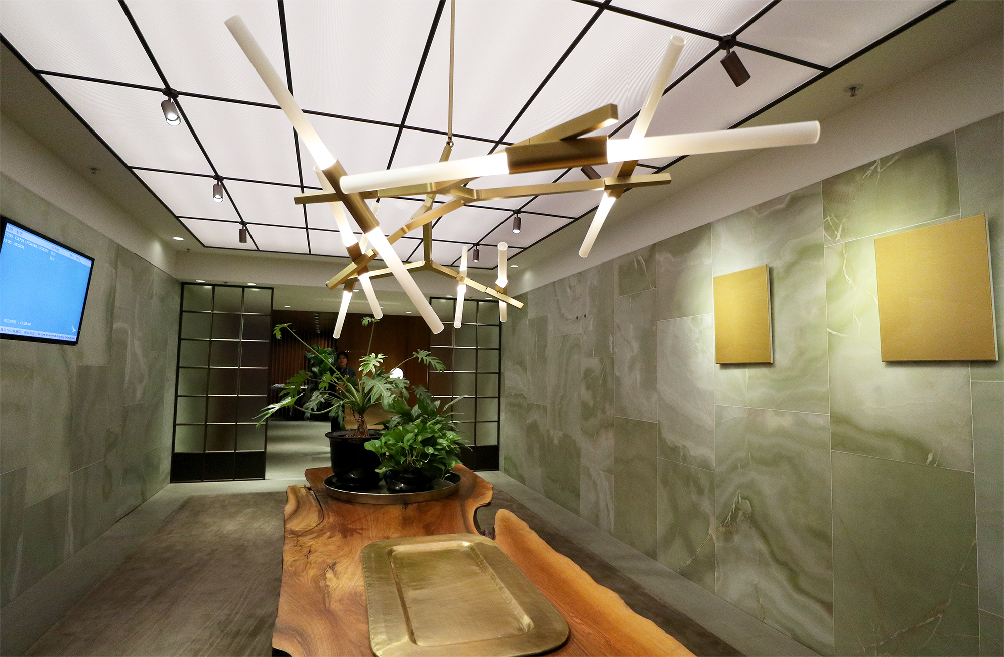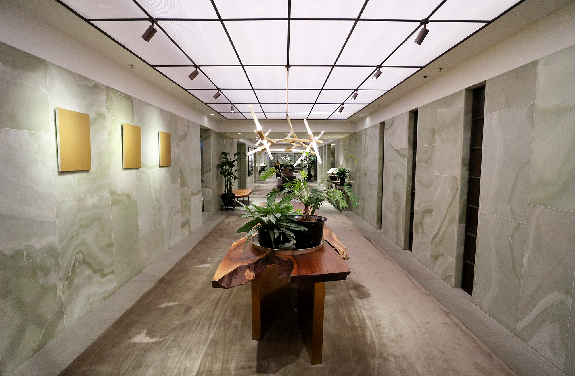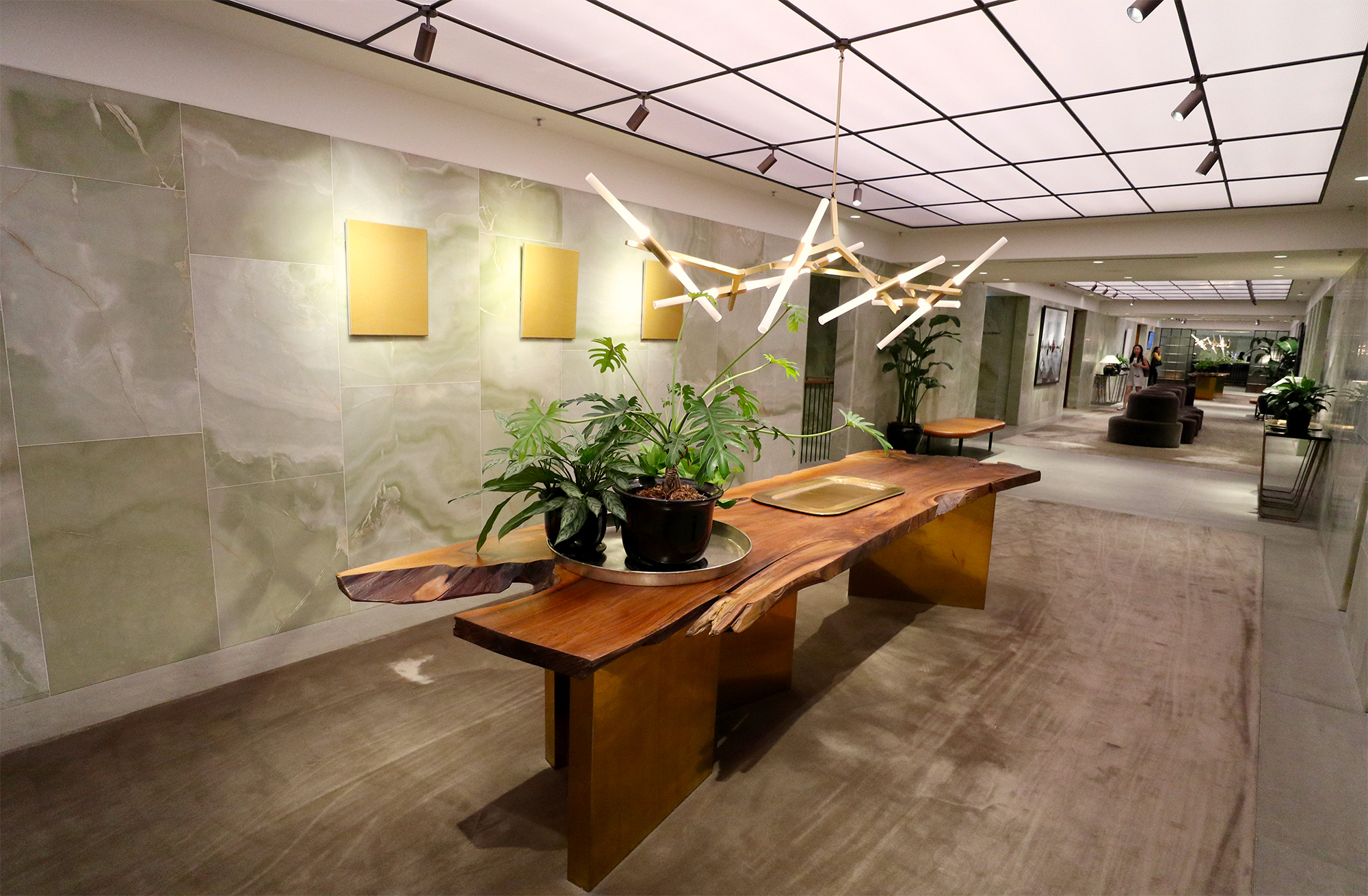 Separate areas of the lounge are defined by plush carpet interspersed with tiled flooring. The long wooden tables with plants and modern decorative items sit under stunning light fittings.