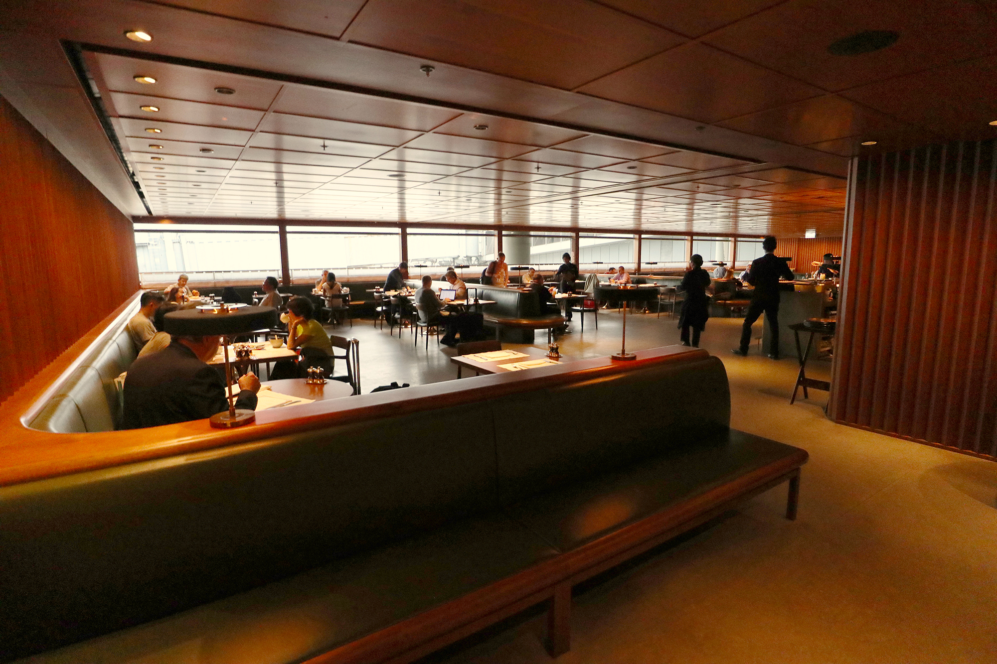 You are greeted by the server at the entrance podium like in a normal restaurant. Inside tables are located in three ‘U’ shapes alongside windows overlooking the aircraft and runways.