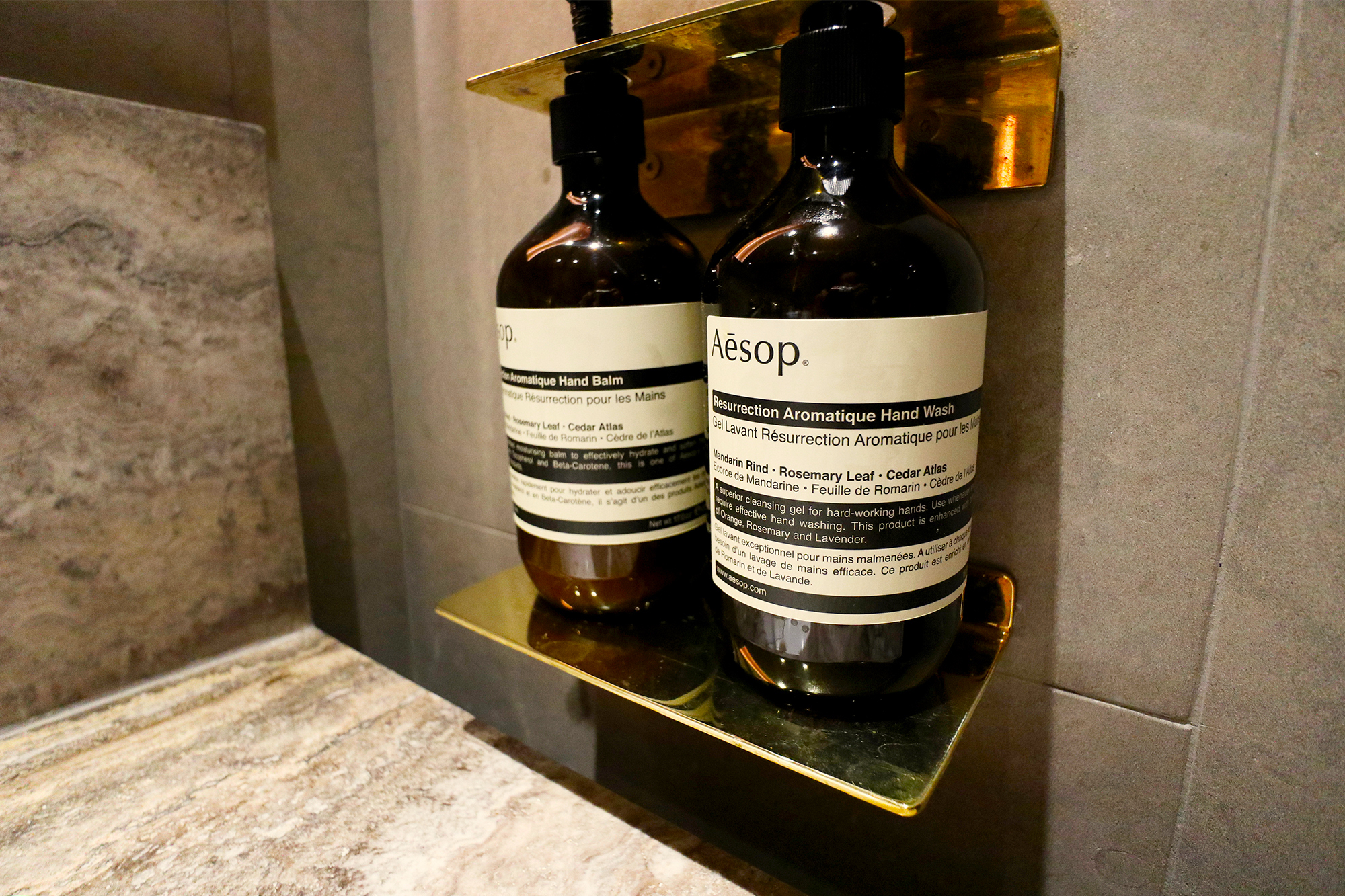 Grey tiles and marble are offset with warm wood panelling and gold fixtures, a combination, which sounds a little over the top but actually works well.
