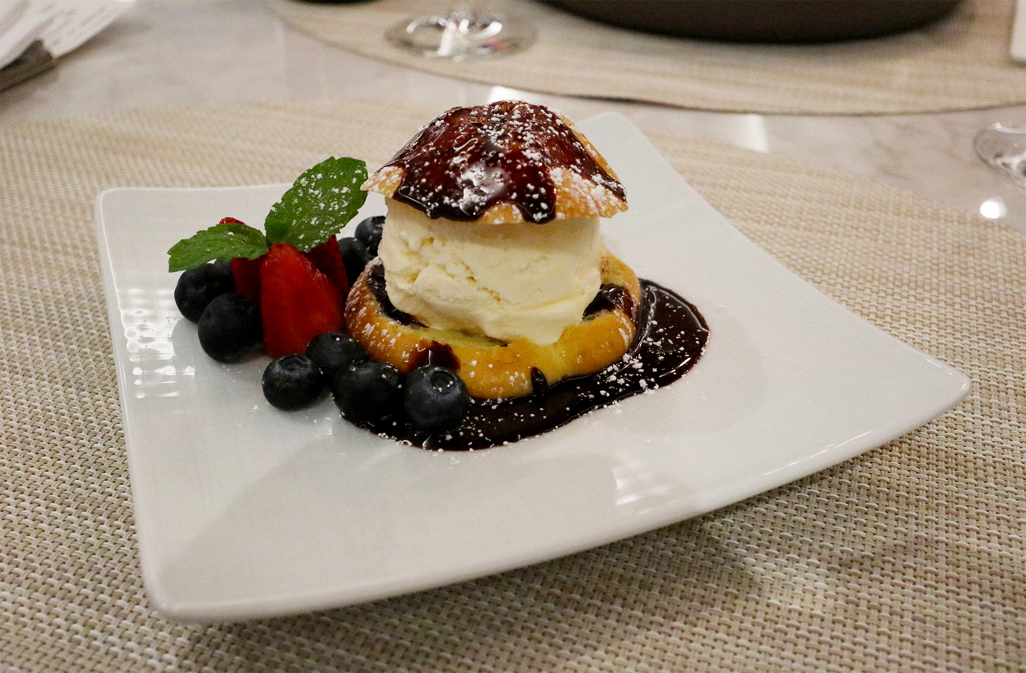Finally for dessert we just had enough room to share the Profiteroles with vanilla ice cream – excellent and again very good presentation.