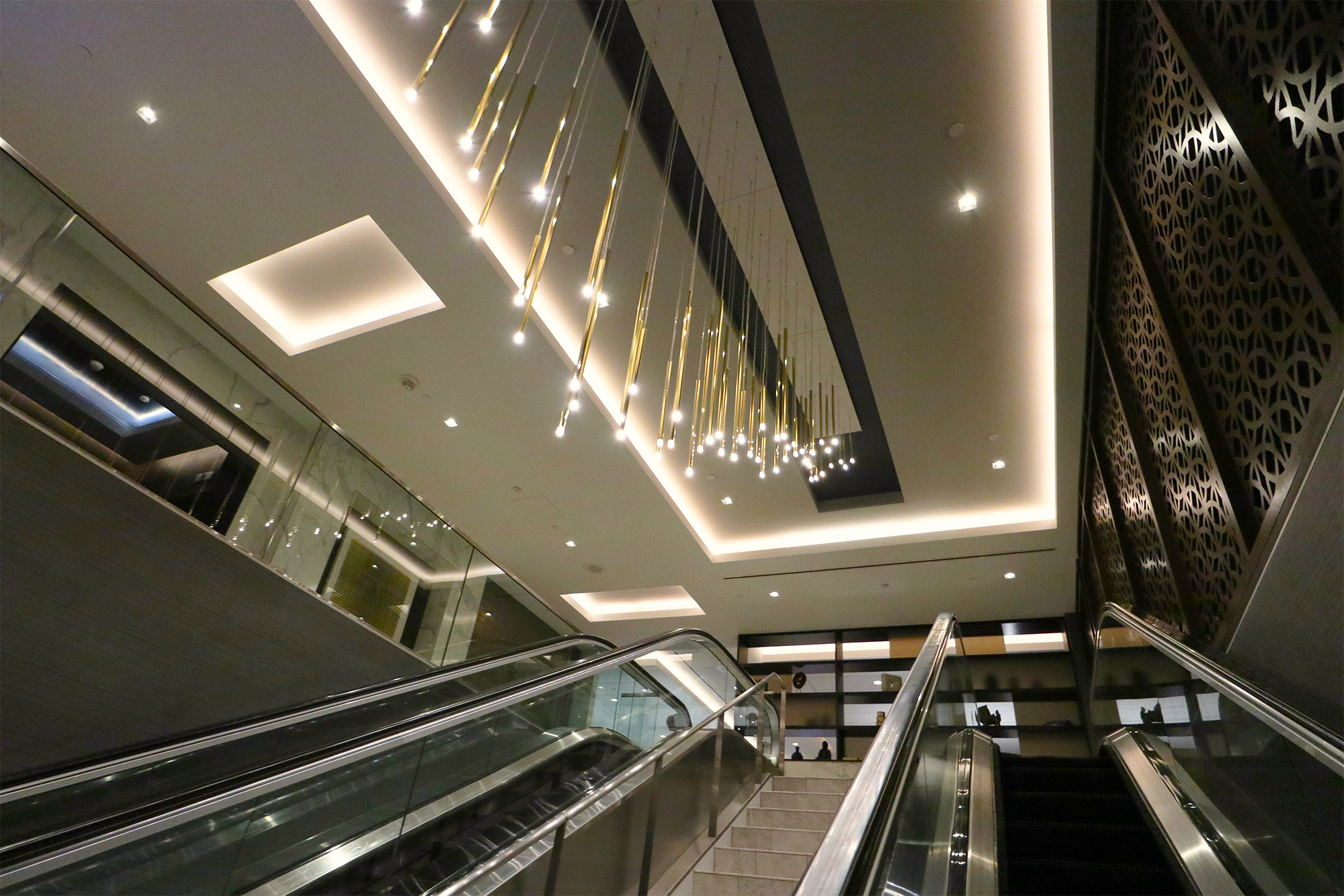 One of the first things that strikes you as you make your way into the Polaris lounge is that this is a two-level facility. A staircase and escalator rise under a stunning light fixture to take you up to the second floor.