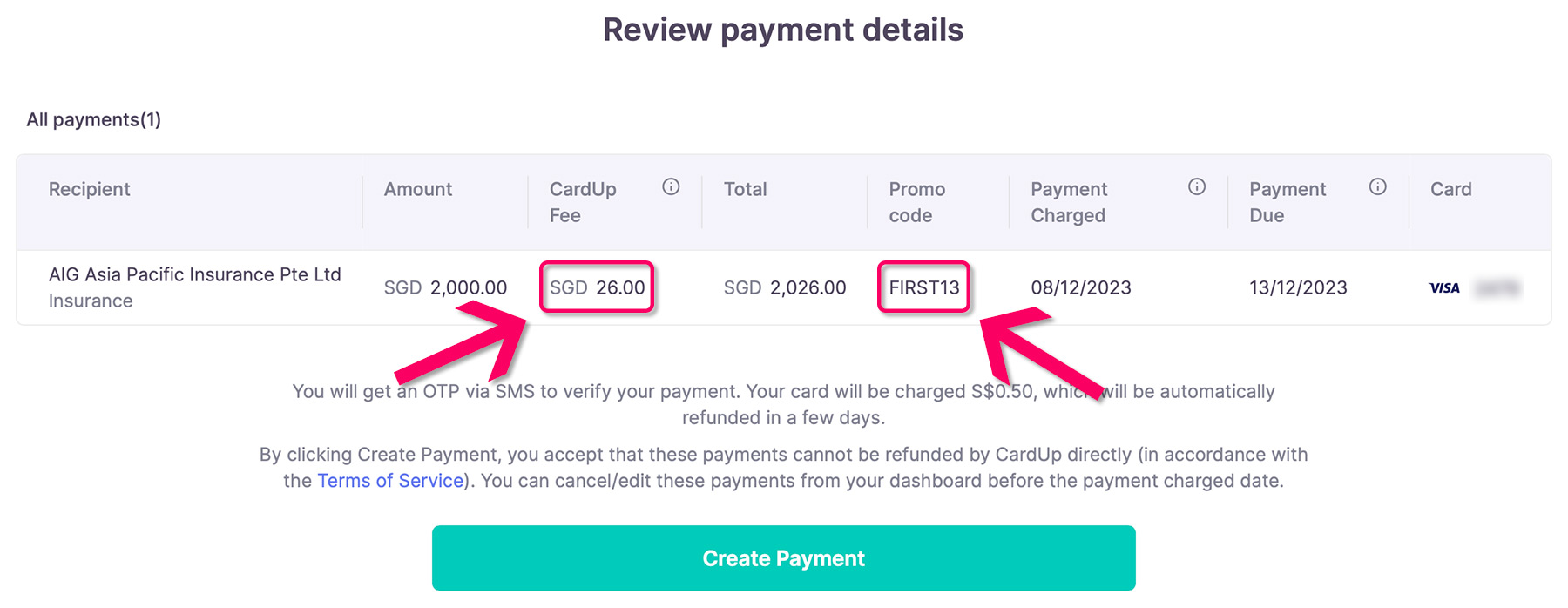 If you schedule a domestic or international CardUp payment using a locally-issued Visa card on or before 26th December 2023, you’ll be entitled to a discounted 1.3% processing fee using promo code FIRST13