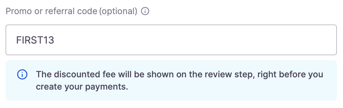 This promo code can be applied to a one-time transaction, or can apply to the first payment in a weekly or monthly recurring payment series.