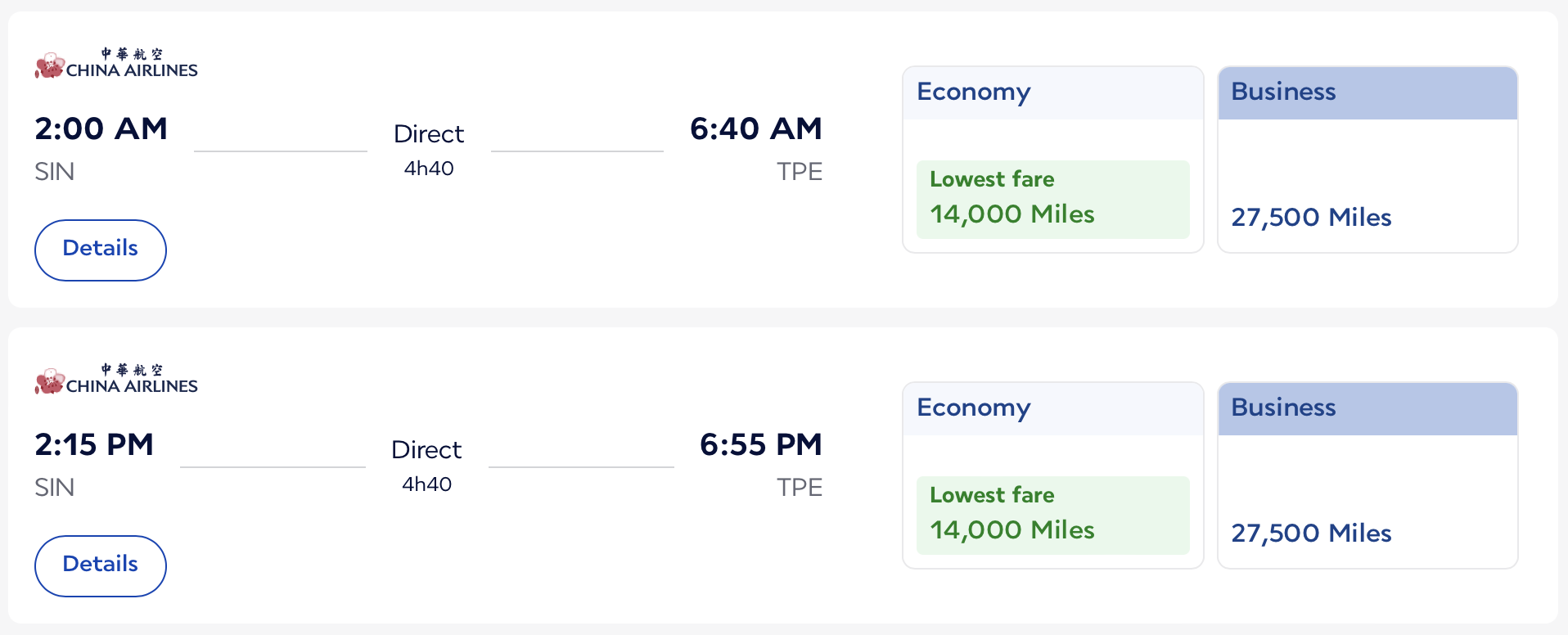 It’s actually better to use the Air France – KLM Flying Blue programme to redeem this route on China Airlines, with only 14,000 miles + S$100 charged in Economy and 27,500 miles + S$100 in Business Class.