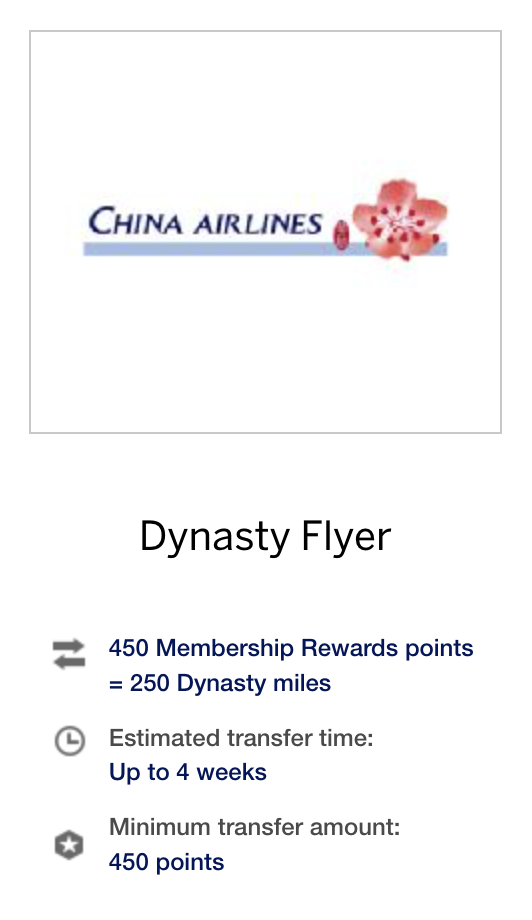 Please note that the ability to transfer Membership Rewards points to the Dynasty Flyer programme by China Airlines will end on 31 December 2023. We apologise for any inconvenience this may cause.