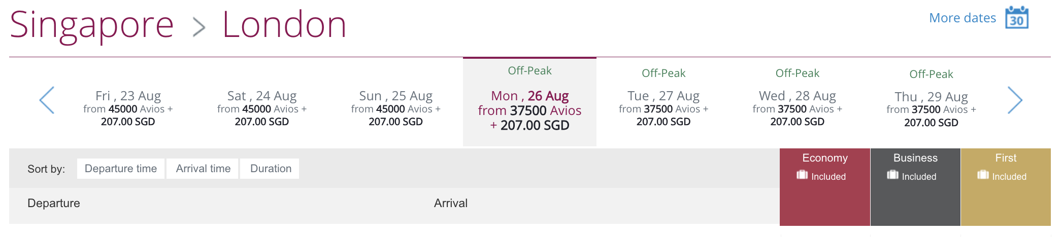 - Awards on peak dates to and from Singapore cost 20% to 25% more Avios than they do on off-peak dates.