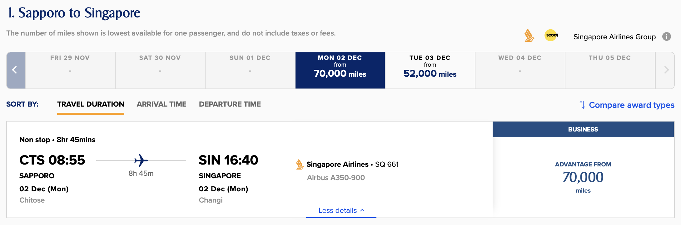 For example, jump online at 8am tomorrow morning – 16th December 2023 – to snag an award on the SQ660 (SIN-CTS) or SQ661 (CTS-SIN) departing on 5th December 2024, and so on.