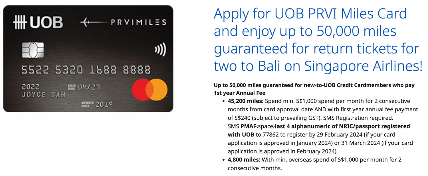 UOB has extended its generous 45,200 miles sign-up bonus for new-to-bank cardholders who sign up for one of its PRVI Miles cards, are approved by 29th February 2024, and spend S$2,000 in the first two months (at least S$1,000 in each monthly period).