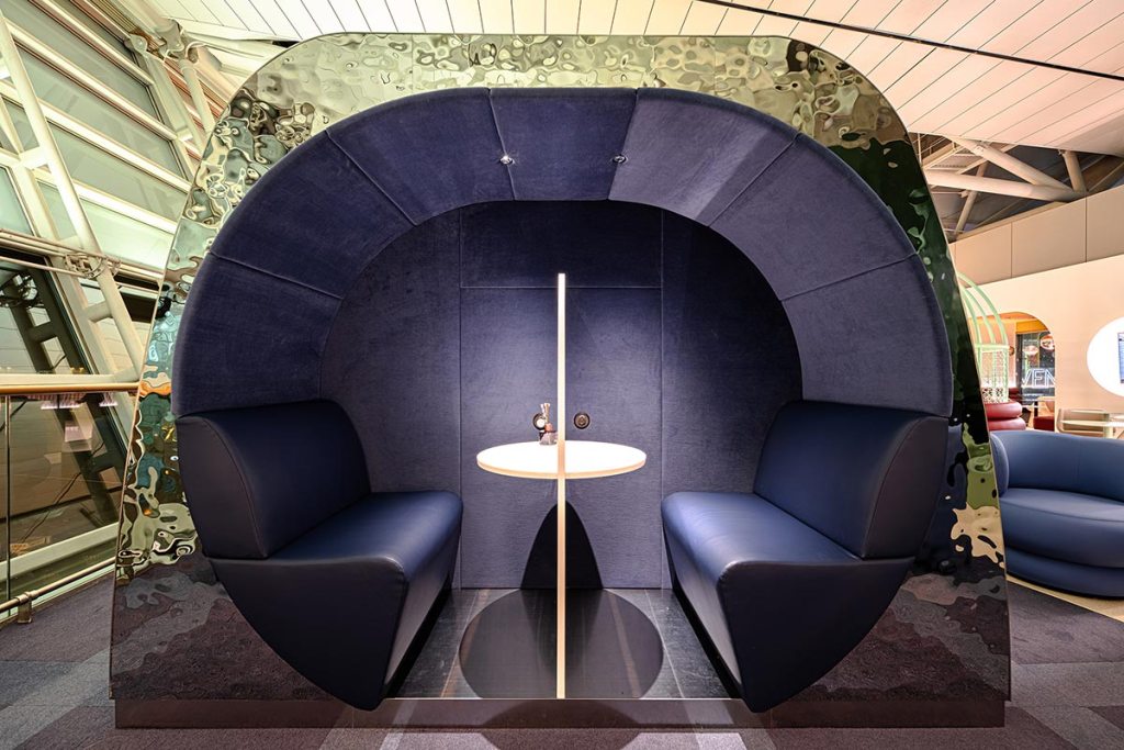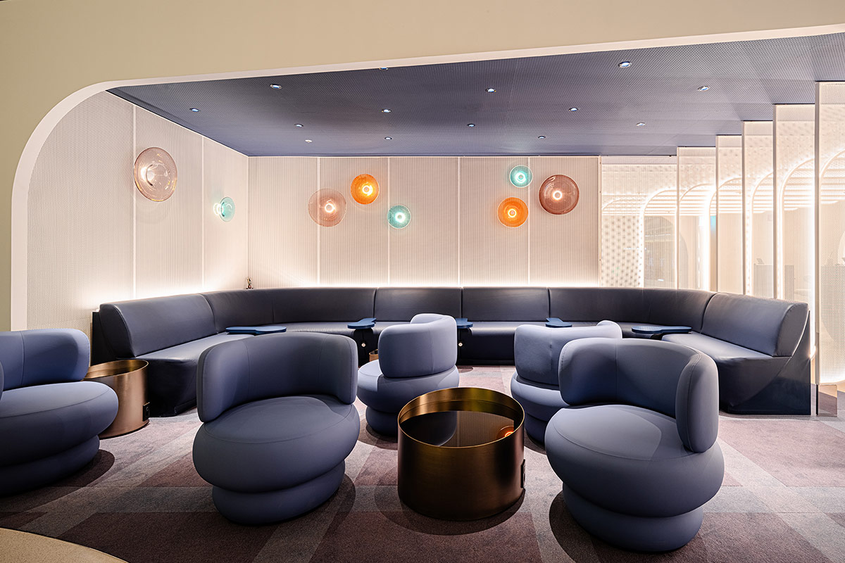 A contemporary, futuristic design by Amsterdam-based creative studio D/DOCK now greets passengers, with a modern, futuristic finish that reminds us most closely of Oneworld carrier Finnair’s home base lounge in Helsinki.