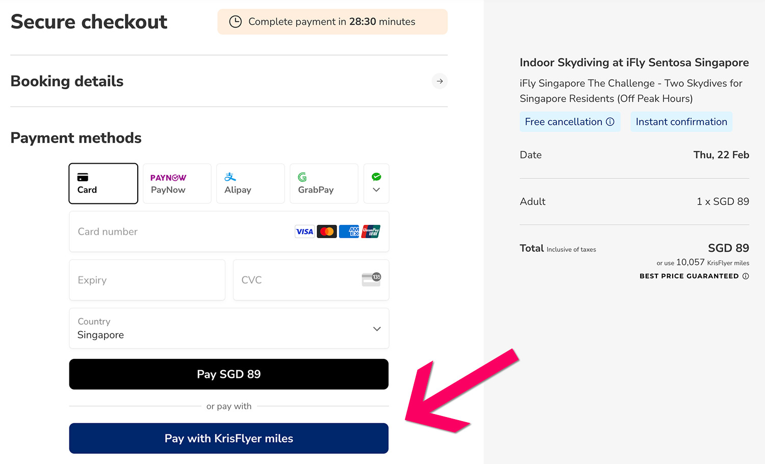 As you can see the usual cost of S$89 is waived if you use 10,057 KrisFlyer miles instead (0.88 cents per mile). Only 57 of your non-expiring miles will be “wasted” with this redemption, which probably isn’t a dealbreaker.