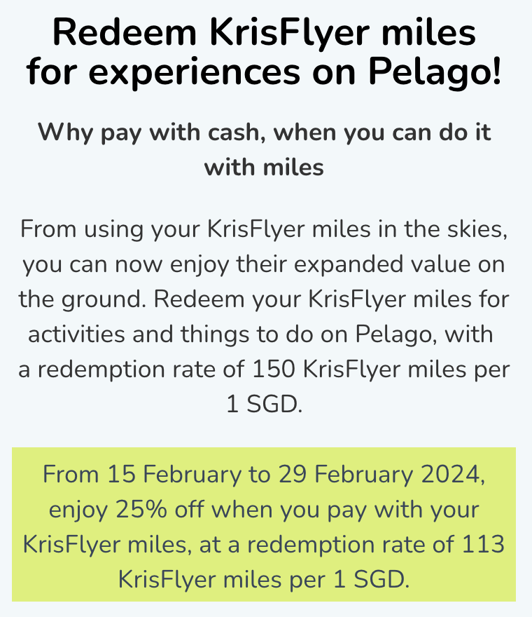 Pelago has now launched a new offer, with a 25% redemption discount, meaning only 113 KrisFlyer miles will get you S$1 off an experience booking (0.88 cents per mile value), between 15th February 2024 and 29th February 2024.