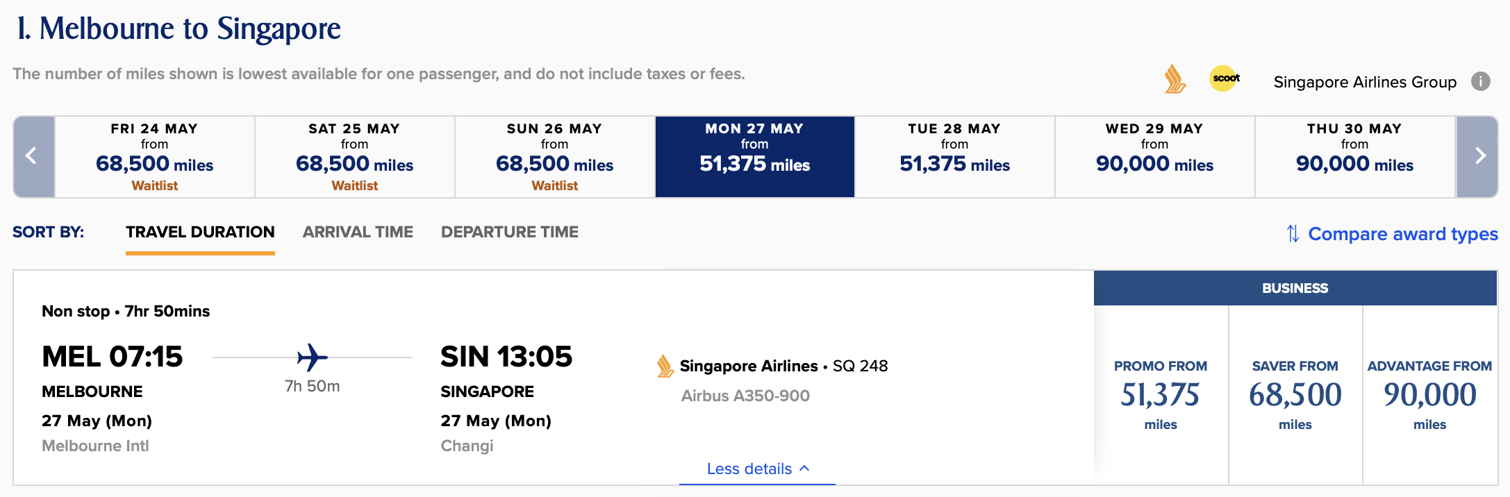 This brings redemption rates down to as little as 16,125 miles in Economy Class to Perth, though 51,325 miles from Melbourne to Singapore in Business Class is also a great deal, for travel in late May and early June this year.