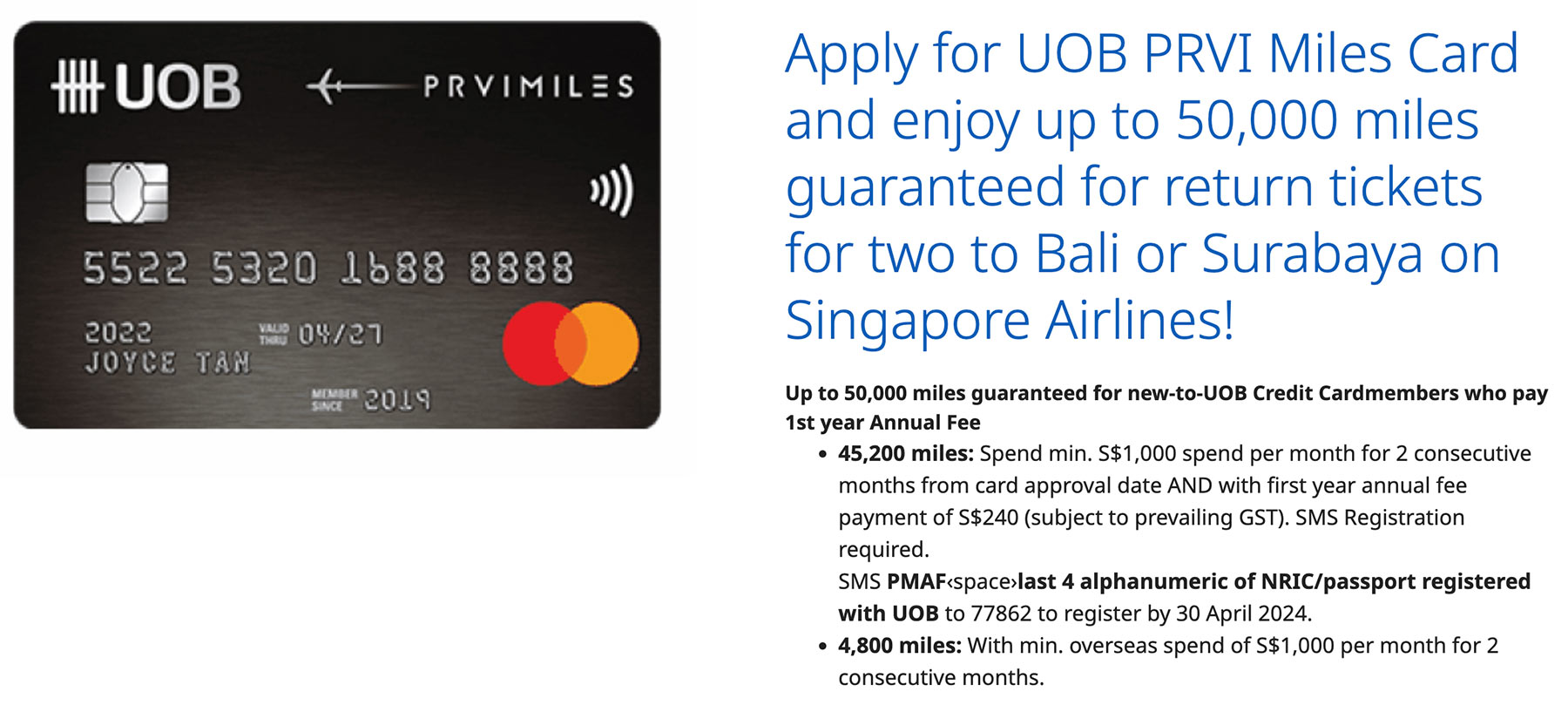 Provided you’re a new UOB credit card holder, simply apply and have your card approved between 1st March 2024 and 31st March 2024 and you’ll get a 45,200 miles bonus, provided you: