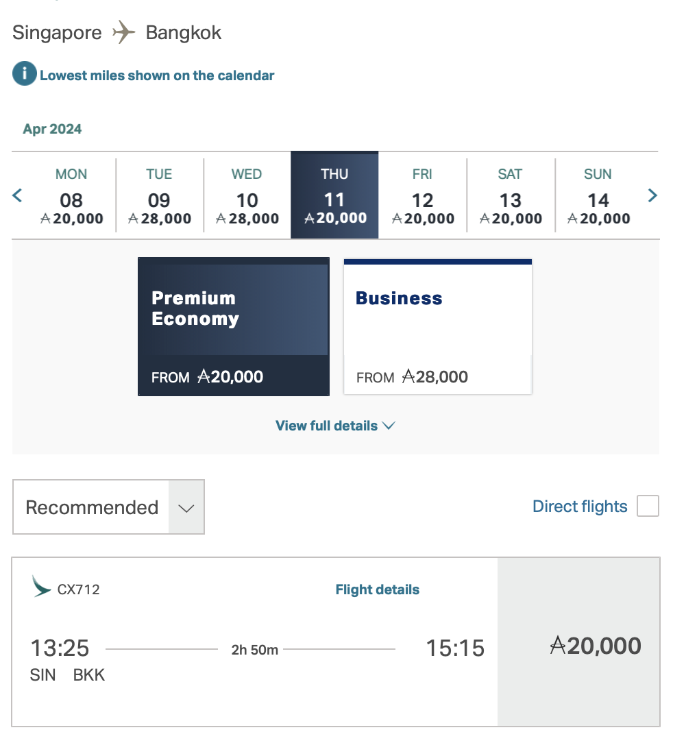Cathay Pacific is loading generous award space on Singapore – Bangkok flights based on our searches, with two immediately confirmable seats in Business Class and four in Economy Class on most flights using Asia Miles or Avios points.