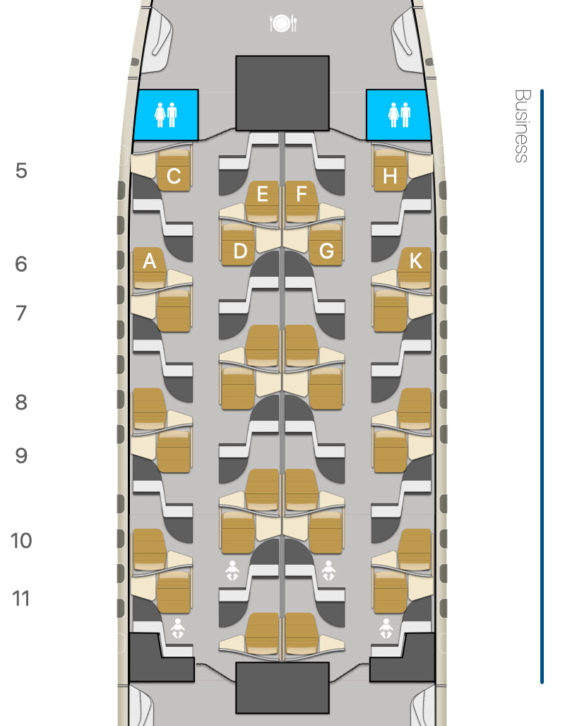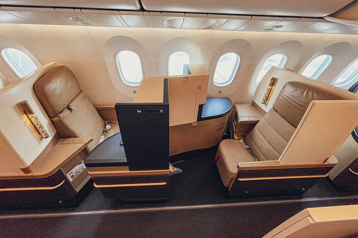 On these Singapore flights, Etihad uses its two-class Boeing 787-9 aircraft with the older ‘Etihad Studio’ Business Class seats from Safran Seats (formerly Zodiac Aerospace), with an alternating forwards-backwards facing configuration.