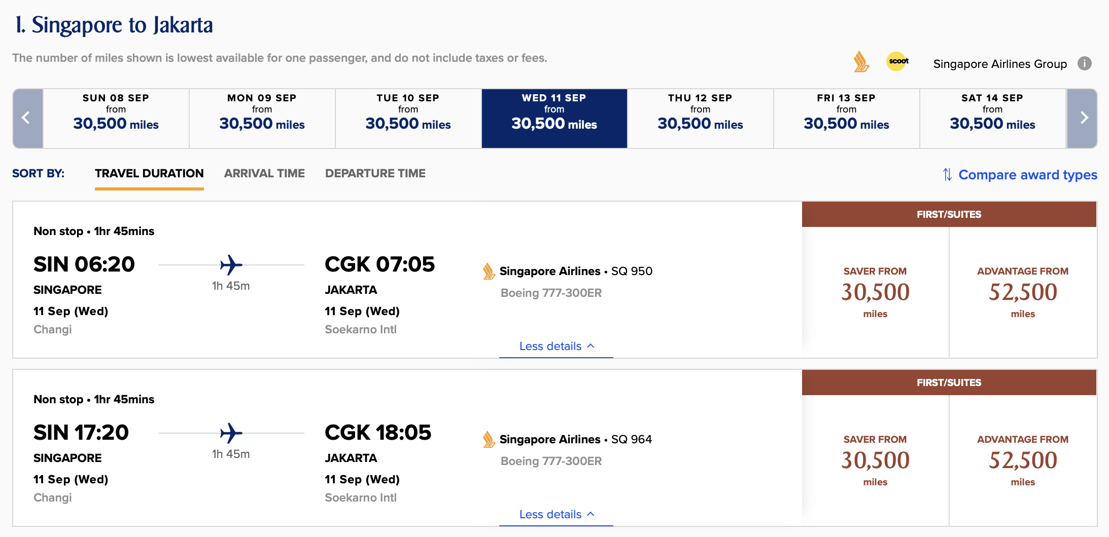 As you can see, you’re now restricted to SQ950 and SQ964 from Singapore to Jakarta each day, or to SQ953 or SQ965 from Jakarta to Singapore, if it’s a First Class seat you’re after.