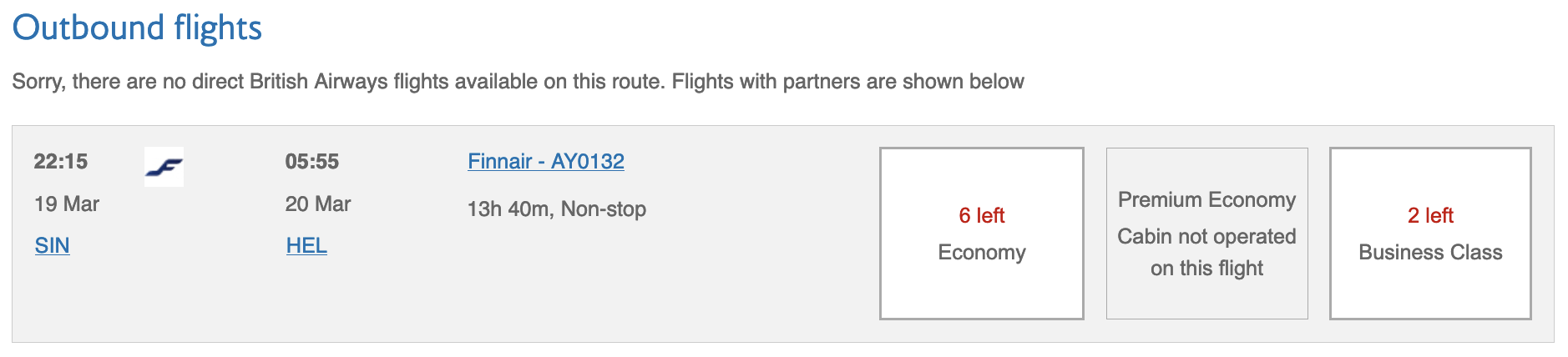Finnair also applies only a modest fuel surcharge (S$21.90 on SIN-HEL), so in addition to mandatory taxes and airport fees the total redemption cost for a one-way Singapore – Helsinki trip using BA Avios is 62,500 Avios + S$87.10.