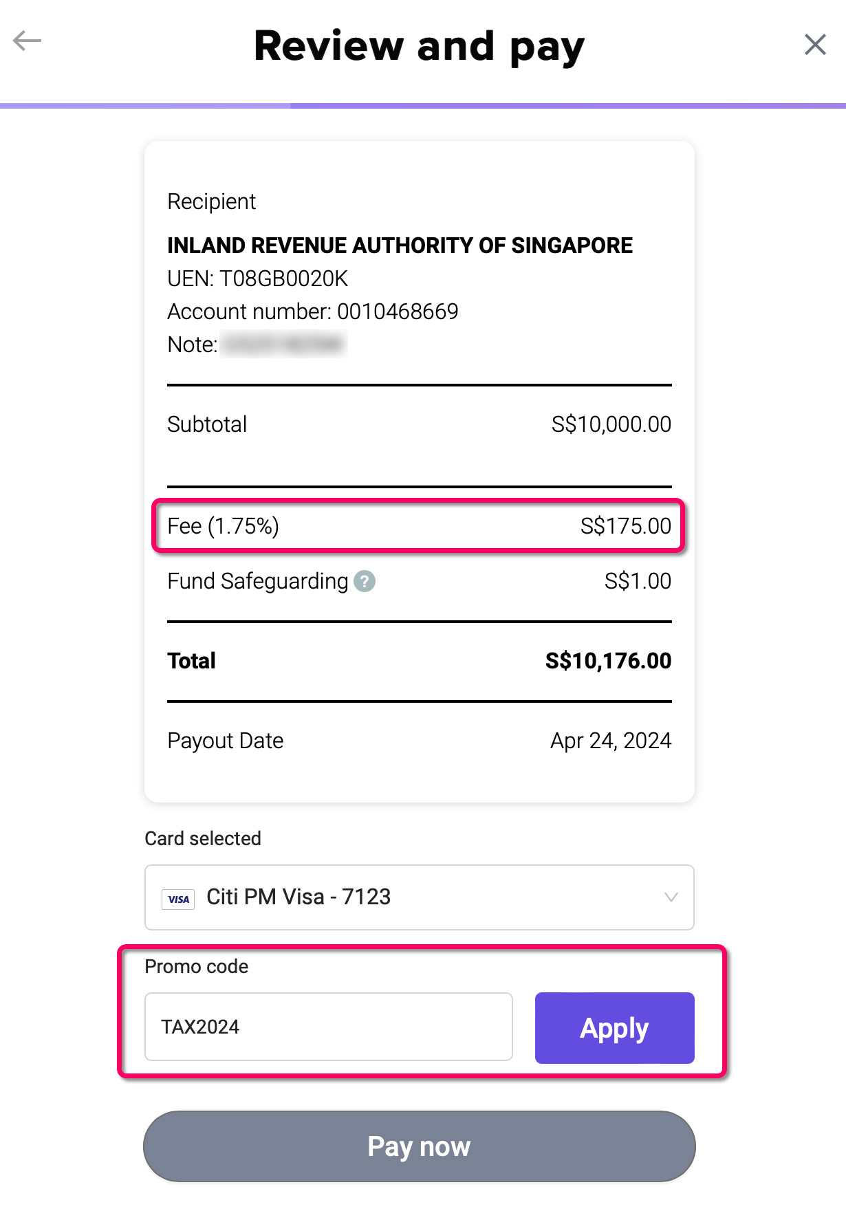 Once applied, you will see the fee drop from 2.25% to 1.75%. In this example an income tax payment of S$10,000 now carries a fee of S$175 (1.75%) instead of S$225 (2.25%).