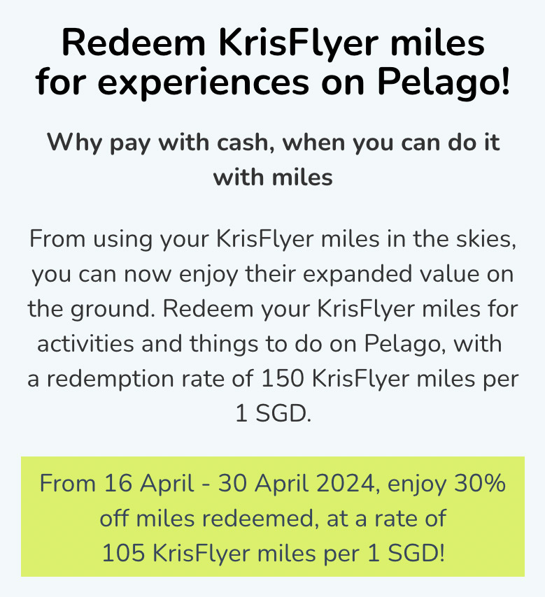 Pelago has now launched a new offer, with a 30% redemption discount, meaning only 105 KrisFlyer miles will get you S$1 off an experience booking (0.95 cents per mile value), between 16th April 2024 and 30th April 2024.