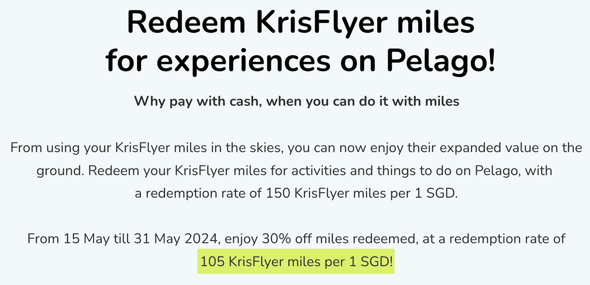 Pelago has now launched a new offer, with a 30% redemption discount, meaning only 105 KrisFlyer miles will get you S$1 off an experience booking (0.95 cents per mile value), between 15th May 2024 and 31st May 2024.