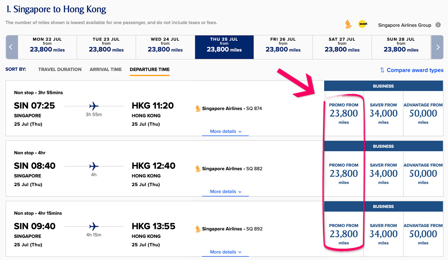 Singapore Airlines offers the Spontaneous Escapes deals under its “Promo” award category, which you’ll see alongside the usual Saver and Advantage award rates on applicable flights.
