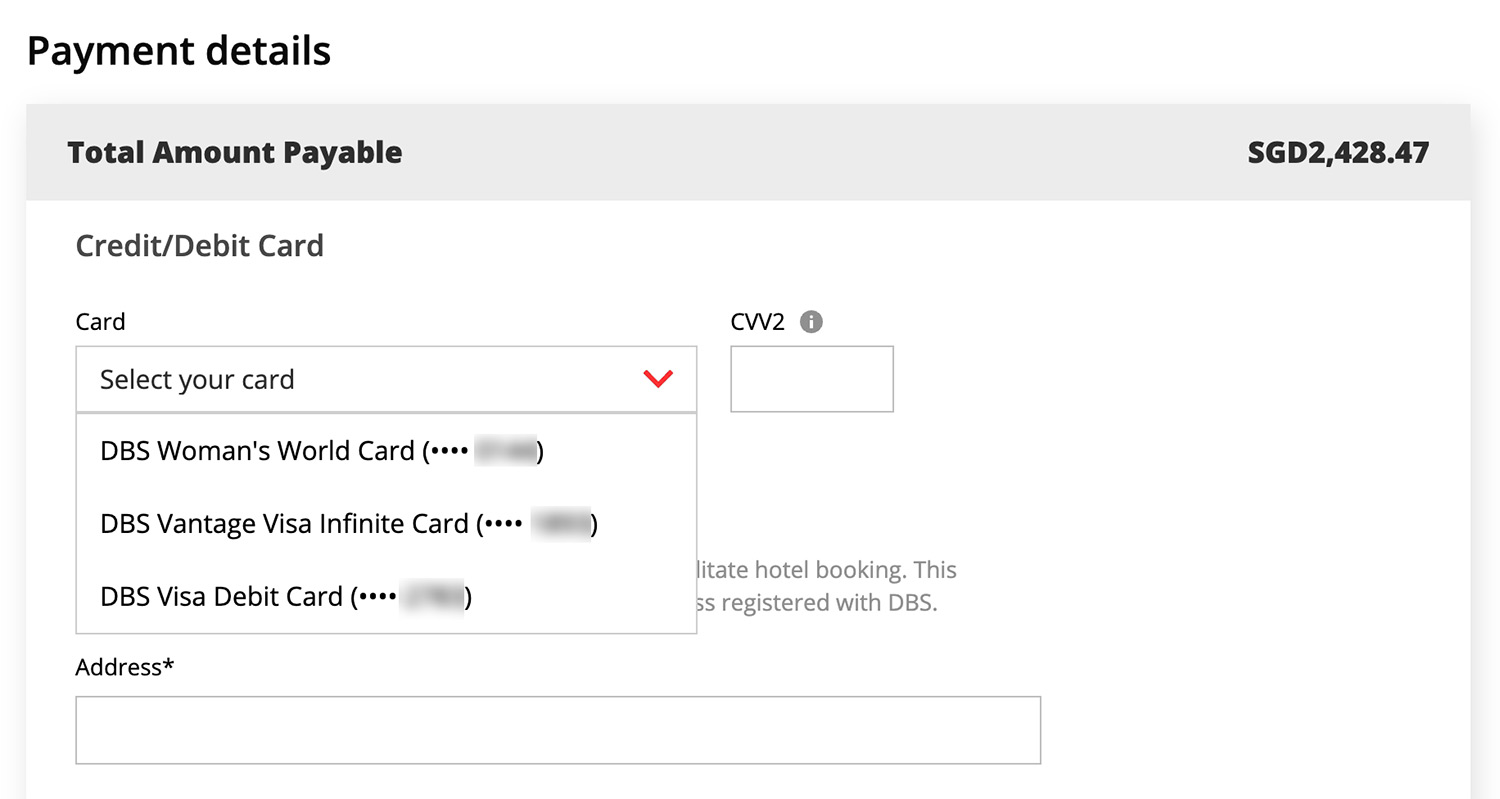 You can then select which DBS card you wish to use to make payment, so be sure to select the one with the best base earn rate, which you’ll receive in addition to the 3 mpd bonus.