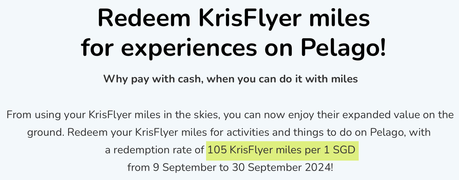 Pelago has brought back a bonus offer, with a 30% redemption discount, meaning only 105 KrisFlyer miles will get you S$1 off an experience booking (0.95 cents per mile value), between 9th September 2024 and 30th September 2024.
