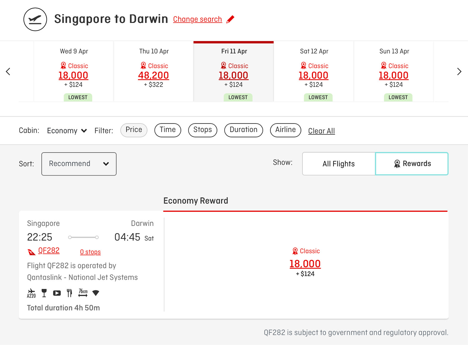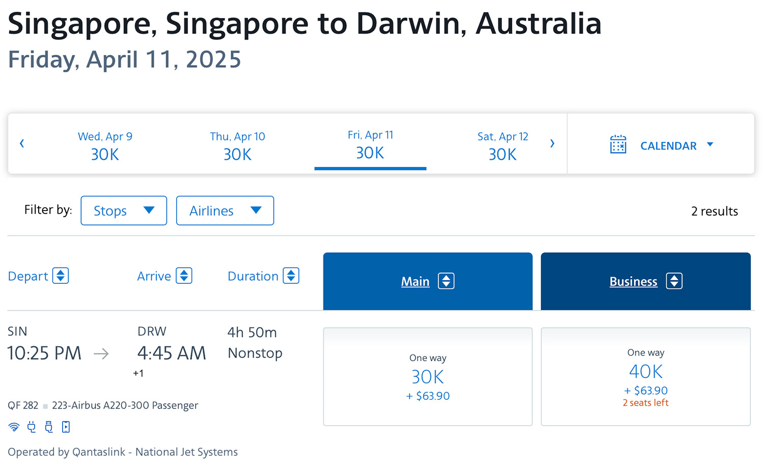 Award space is available on this route from 13,000 miles one-way, a big saving on the 21,500 KrisFlyer miles Singapore Airlines is charging for an Economy Class saver redemption between Singapore and Darwin.