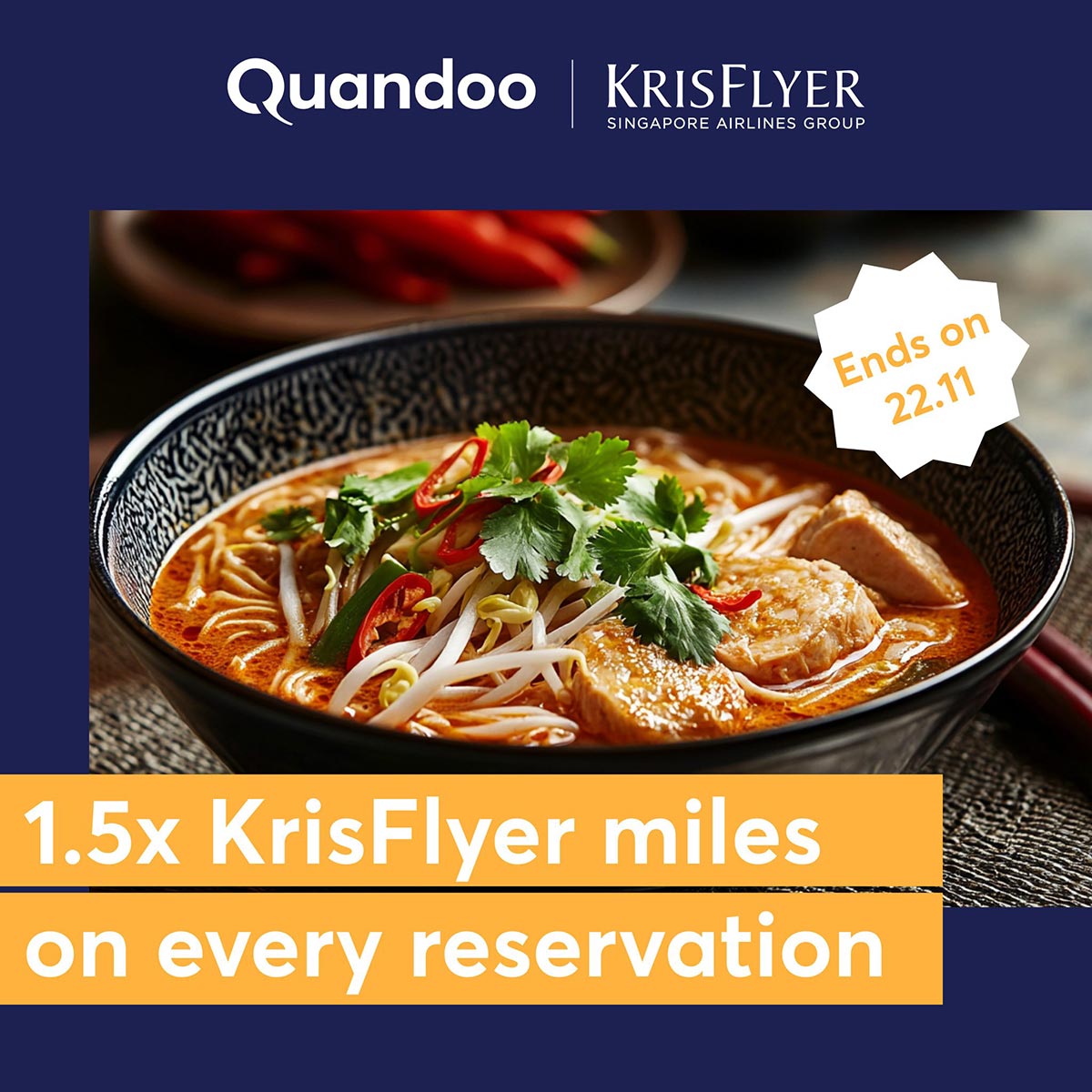 Quandoo has now announced a month-long 50% bonus miles earning promotion, running from 21st October 2024 until 22nd November 2024, which will allow you to net 150 KrisFlyer miles for each attended restaurant reservation, instead of the usual 100 miles.