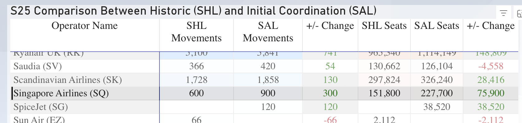 With its Manchester departures set to wind down from 10 per week (requiring 20 weekly takeoff and landing slots) to just 5 per week by the end of March next year, following the cessation of the Houston route, we expected Singapore Airlines to apply for only 10 weekly slots (enough for 5 takeoffs and landings per week) for the summer 2025 season.
