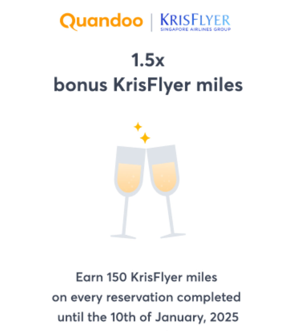 Quandoo has now announced a month-long 50% bonus miles earning promotion, running from 9th December 2024 until 10th January 2025, which will allow you to net 150 KrisFlyer miles for each attended restaurant reservation, instead of the usual 100 miles.