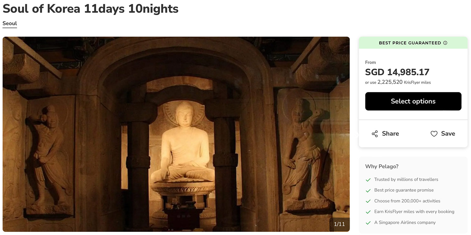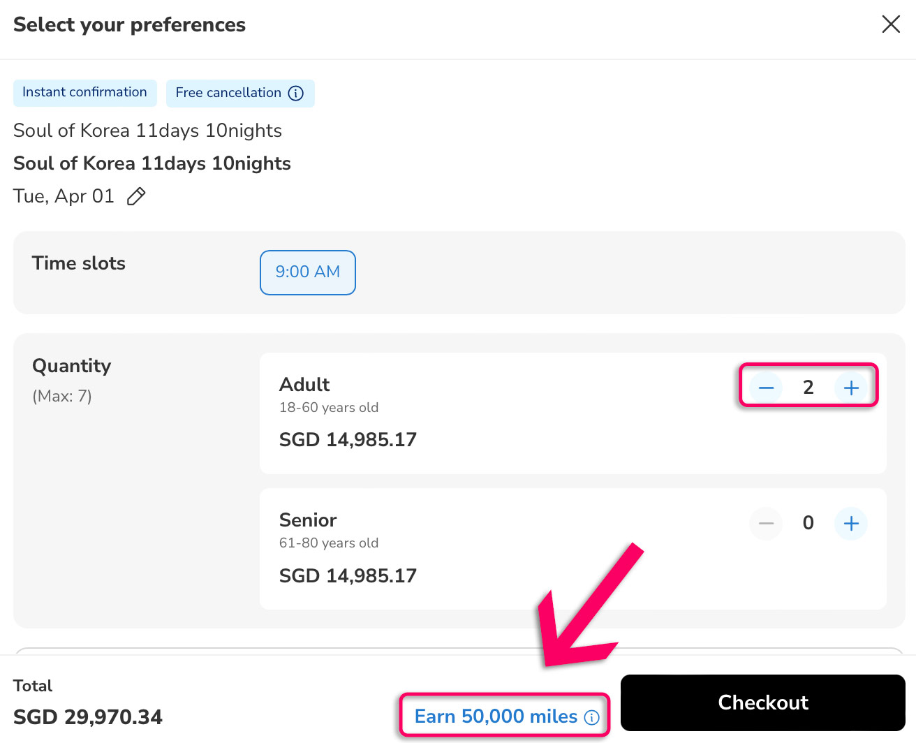 If you are locking in a very expensive experience, such as this 10 night tour of Korea at S$14,985 per person, you can maximise your miles accrual by making two separate bookings.